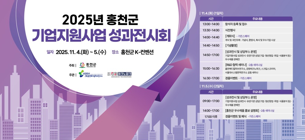 우리군 기업지원사업 성과공유 및 우수제품 홍보를 위해 「2025년 홍천군 기업지원사업 성과전시회」를 아래와 같이 개최하오니, 군민 여러분의 많은 관심과 참여 부탁드립니다! 1. 행 사 명: 2025년 홍천군 기업지원사업 성과전시회
