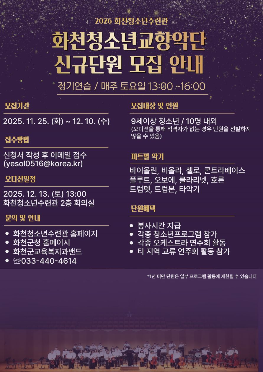 [화천군] 2026 화천청소년문화예술단(교향악단, 합창단, 풍물단) 신입단원 모집