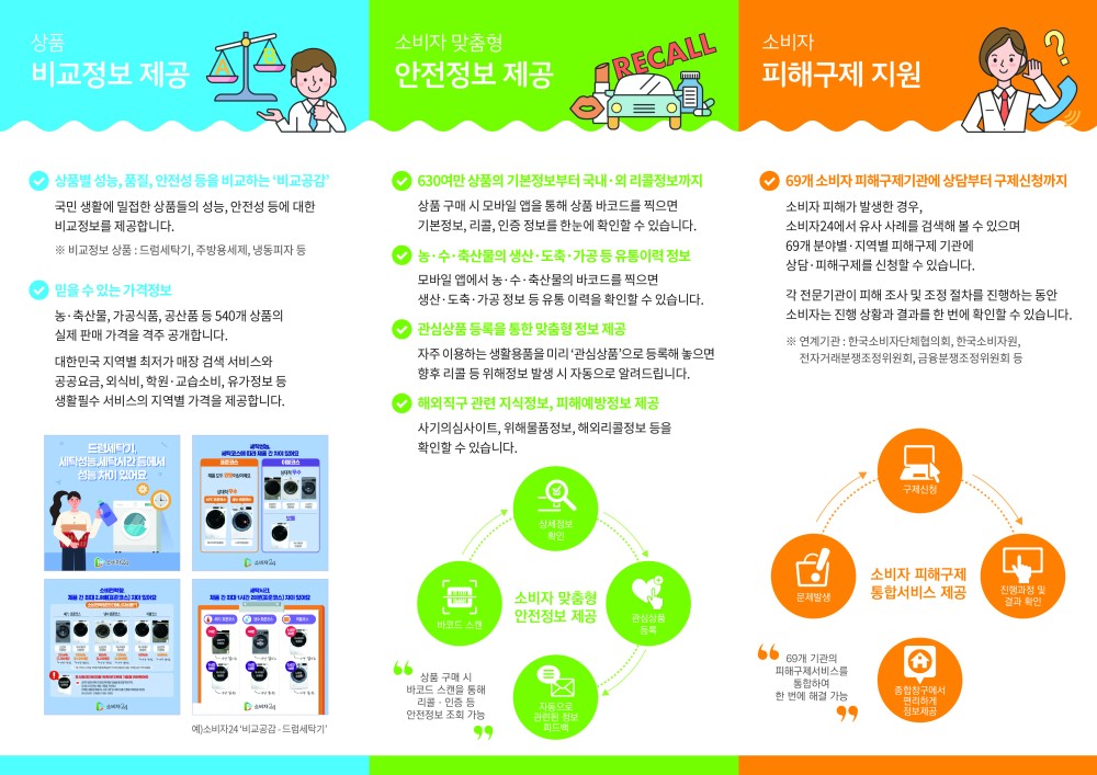 1. 공정거래위원회에서는 국민들이 안심하고 상품 및 서비스를 소비, 이용할 수 있는 환경을 조성하기 위해 95개 기관을 연계한 소비자 종합포털(소비자24, www.consumer.go.kr)을 통하여 소비생활정보(상품 비교정보, 리콜정보, 위해정보, 물품정보 등) 및 피해구제 신청창구 통합 등의 서비스를 지공하고 있습니다.