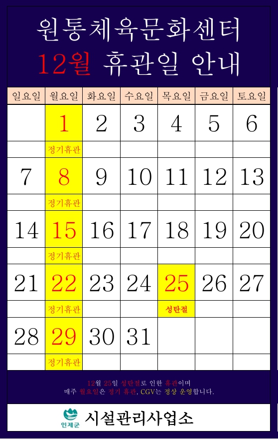 [인제군] 원통체육문화센터 12월 운영달력 및 (수영,라인댄스,요가 )강습 모집 안내