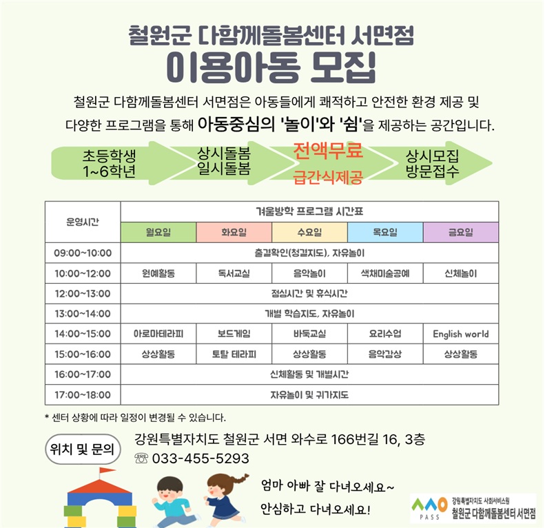 철원군 다함께돌봄센터(서면점)에서 2026년 “ 겨울방학돌봄교실 이용아동"을 아래와 같이 모집하오니