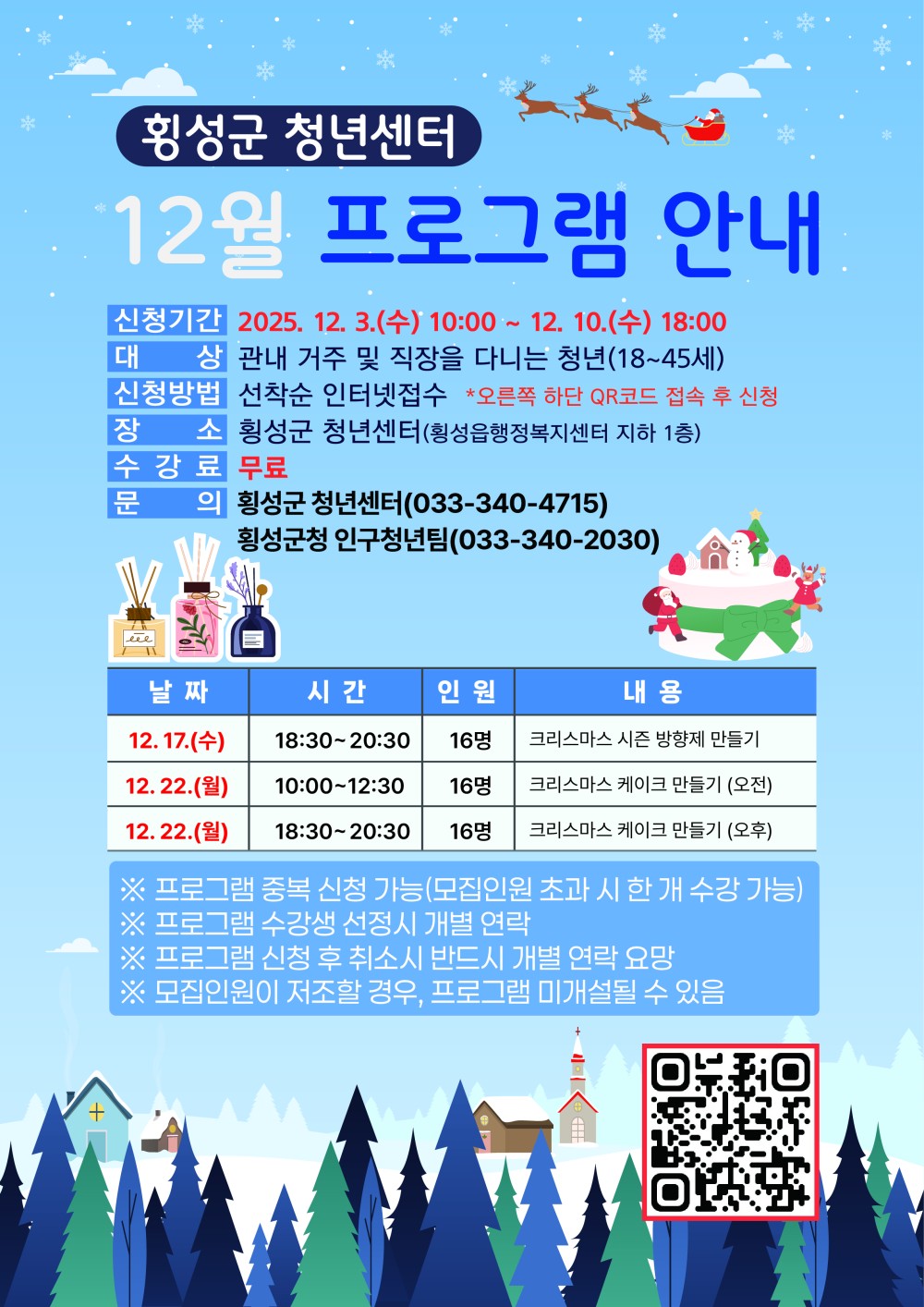 [횡성군] [대표] 횡성군 청년센터 12월 프로그램 수강생 모집 안내