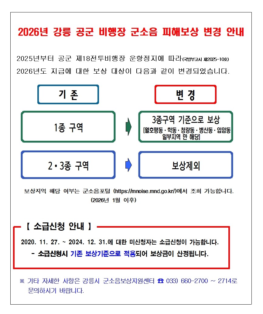 [강릉시] 2026년 강릉 공군 비행장 군소음 피해보상 변경 안내