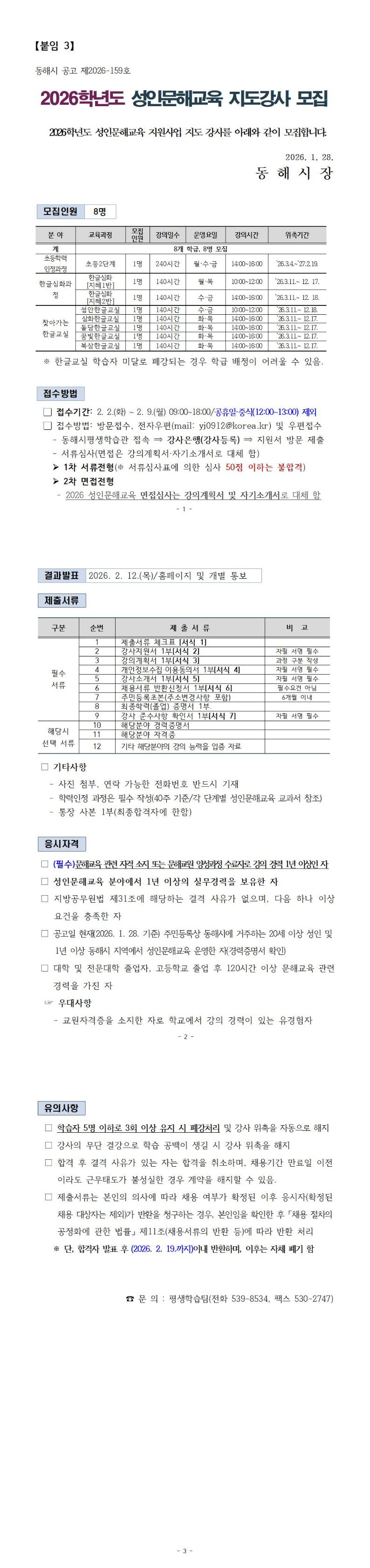 [동해시] 2026학년도 성인문해교육 지도강사 모집