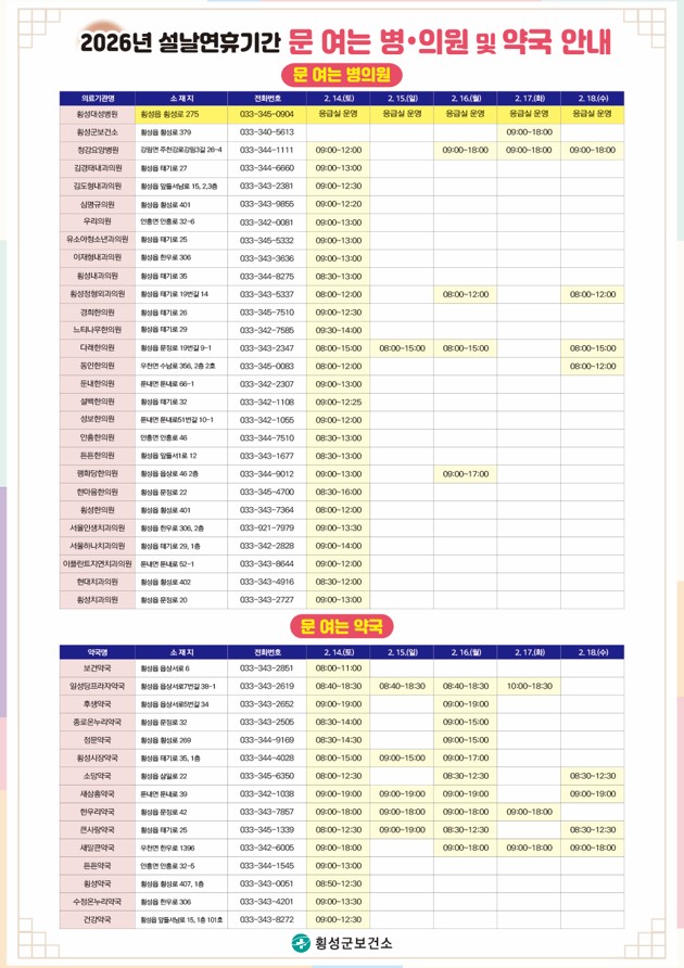 [횡성군] [보건소] 2026년 설 연휴기간 문여는 병·의원 및 약국 안내