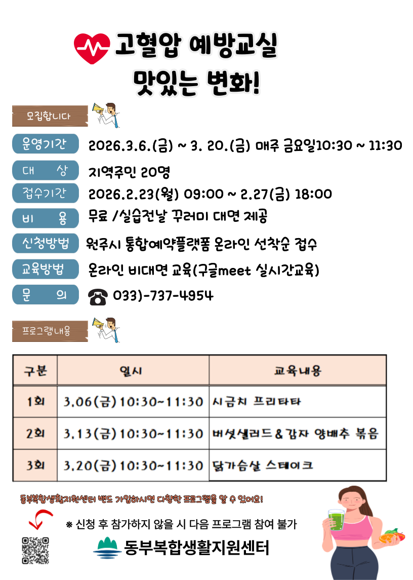 [원주시] 동부복합생활지원센터 건강관 고혈압 예방 요리 교실 「맛있는 변화」 참여자 모집