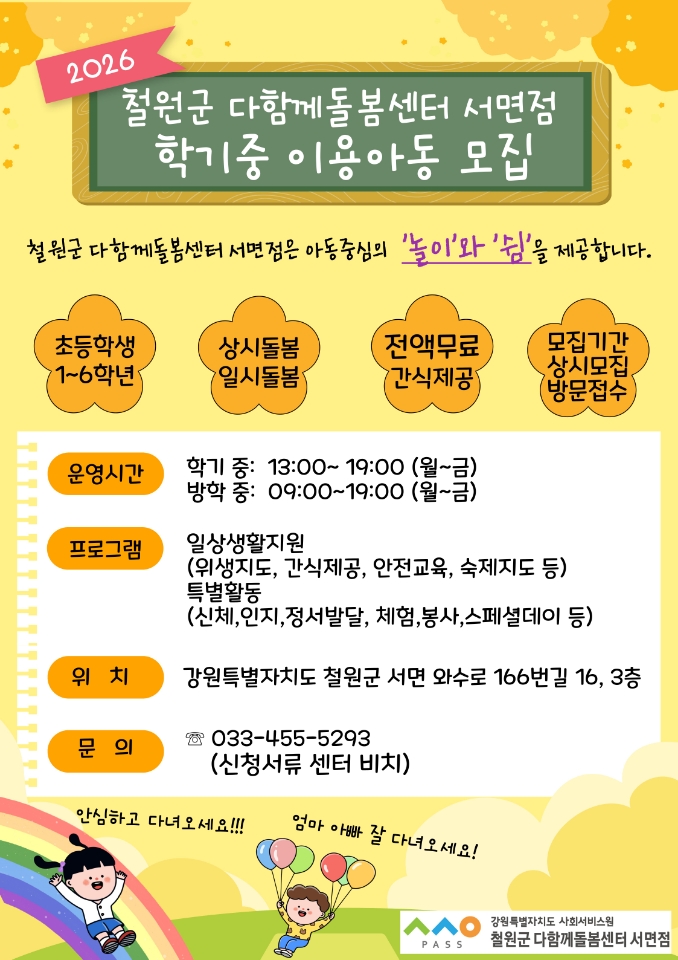[철원군] 다함께돌봄센터(서면점) 2026년 학기중(1학기) 돌봄교실 이용아동 모집