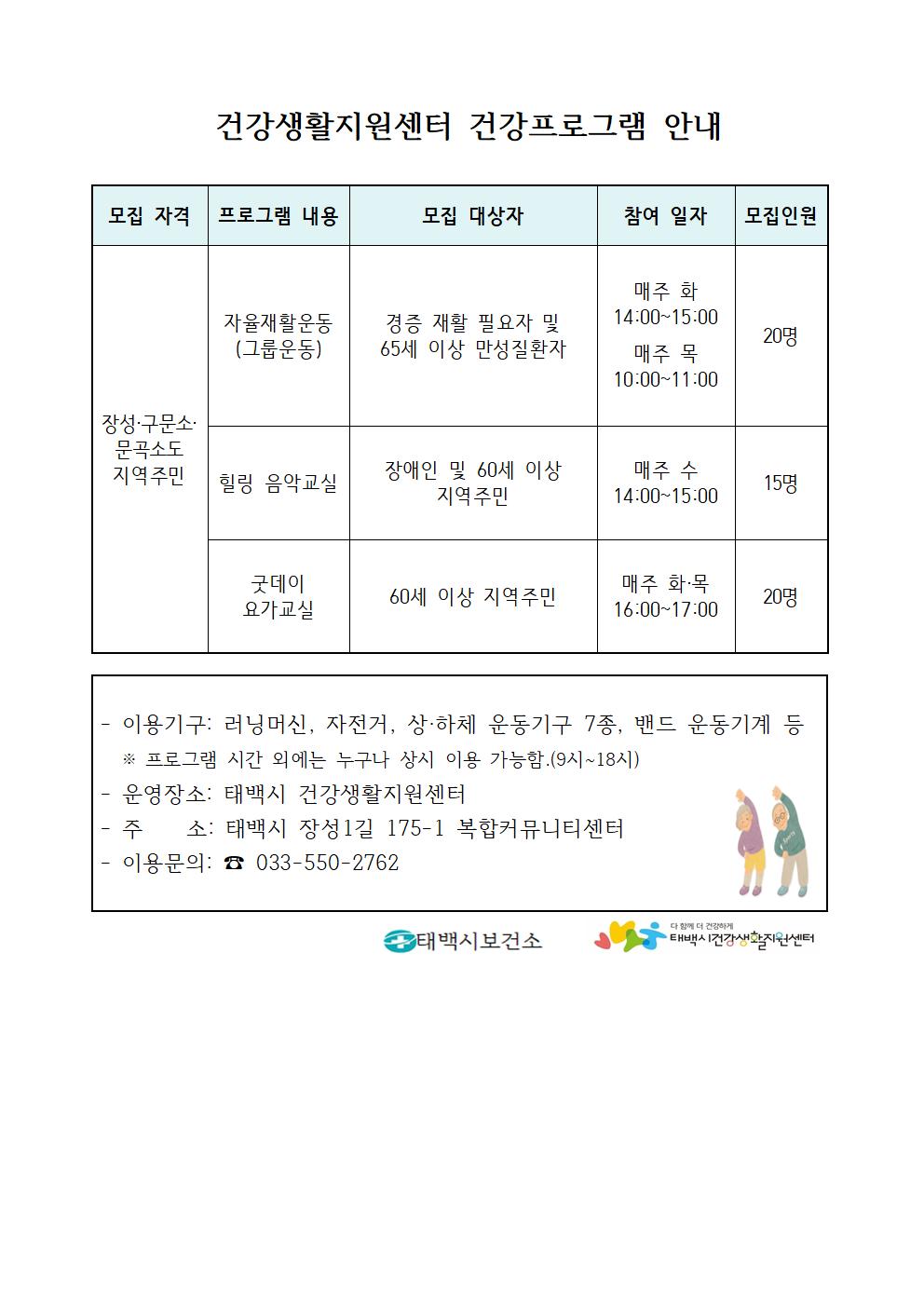 - 참여문의: 태백시보건소 건강생활지원센터 (xxx-xxx-xxxx☎)