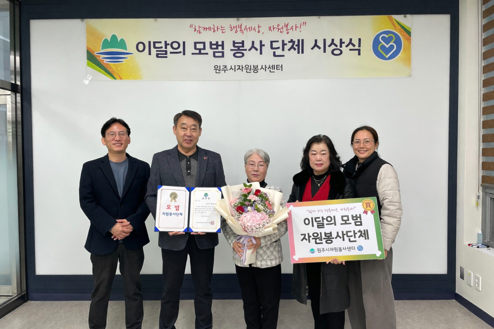원주시자원봉사센터(센터장 최원지)는 2월25일, 이 달의 모범 자원봉사단체로 원주 축협 아름다운 봉사단(회장 김금자)을 선정하고 시상했습니다.
