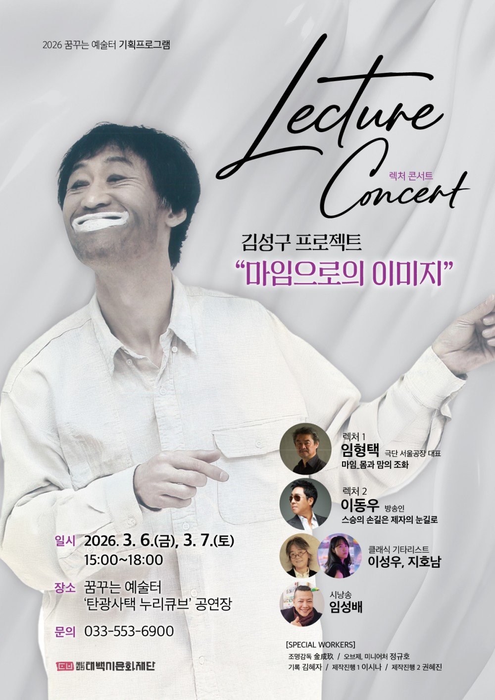 (재)태백시문화재단에서 2026 꿈꾸는 예술터 기획프로그램 마임과 음악, 그리고 깊이 있는 해설이 결합된 렉처콘서트인 김성구 프로젝트 <마임으로의 이미지>를 개최합니다.