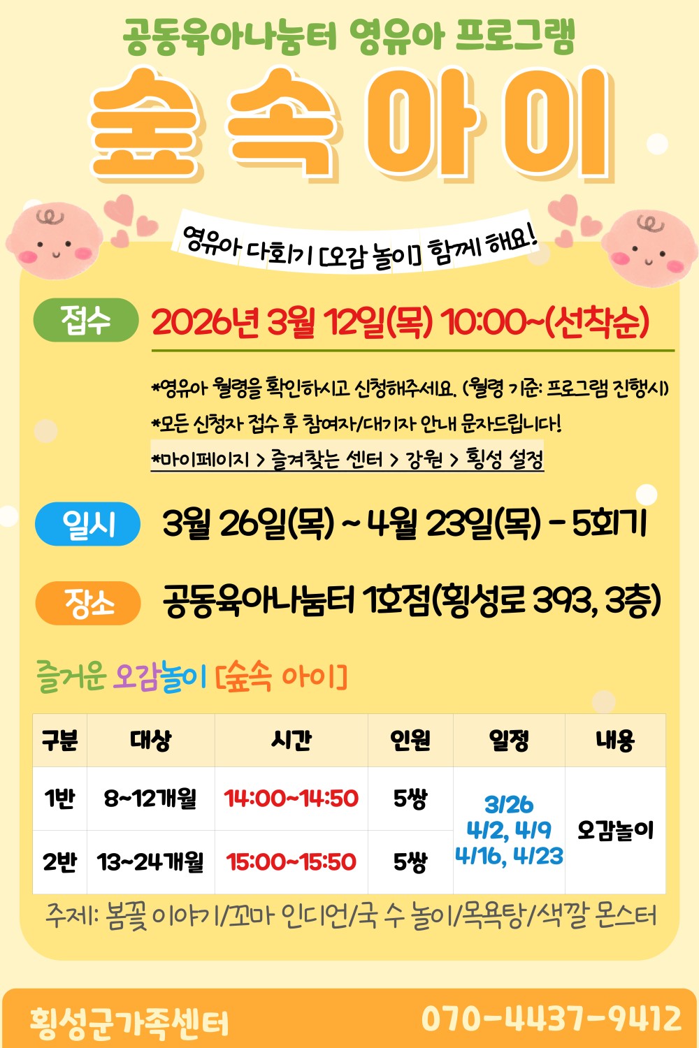 ☀ 접수일: 3월 12일(목) 10:00~ [1.신규 우선 2.선착순] 횡성군가족센터 홈페이지 접수