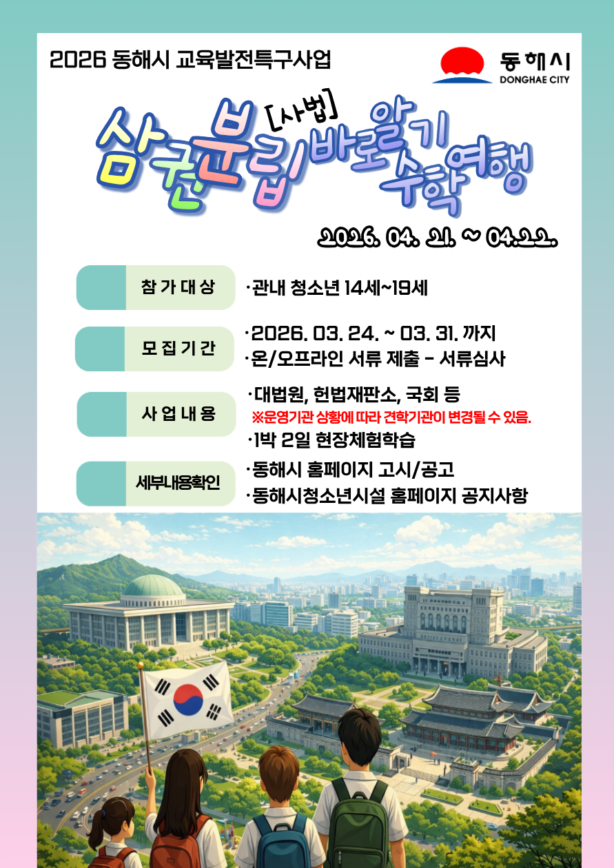 2026 동해시 교육발전특구사업 [삼권분립 바로알기 수학여행]에 참여하여 민주주의와 대한민국 삼권과 헌법을 수학할 청소년을 다음과 같이 공고하오니 관심 있는 분들의 많은 참여 바랍니다.