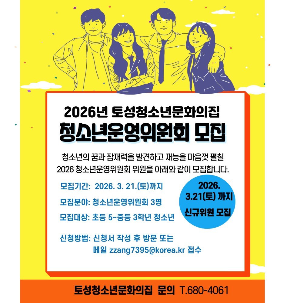 2026년 토성청소년문화의집 청소년운영위원회ㆍ봉사동아리 추가 모집하오니 청소년들의 많은 신청 바랍니다.