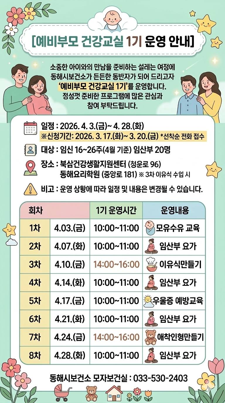 [동해시] 예비부모 건강교실 운영 안내 Home시군별소식62664 윈디 윈디님의 홈 전체게시물 아이디로 검색 윈디님의 홈 전체게시물 아이디로 검색 6시간 9분전 173 0 0 LV.1 62% 관련링크 : https://www.dh.go.kr/www/selectBbsNttView.do;JSESSIONID=DA579C836D1FBC76D337A0E66933CBF9?key=474&bbsNo=172&nttNo=200196&searchCtgry=&searchCnd=all&searchKrwd=&integrDeptCode=&a… 0회 연결 신고 목록 게시글 신고 안내 아래 내용중 해당하는 내용이 있을경우 아래 게시글신고 버튼을 클릭하시고 사유를 작성해주시면 빠른시간 안에 삭제및 필요조치하여 드리겠습니다. 로그인후 이용이 가능합니다. 그리고 답변은 메뉴 아이러브강원 > 1:1문의에서 확인이 가능합니다. 자신 또는 제3자를 비방하거나 중상 모략으로 명예를 손상시키는 내용 범죄행위와 관련이 있다고 판단되는 내용 다른 회원 또는 제3자의 저작권 등 기타 권리를 침해하는 내용 타인의 개인정보, 사생활을 침해하거나 명예를 손상시키는 경우 자신의 글을 타인이 도용한 경우 위의 내용 이외에 기타사항 본문 이미지 확대보기 예비부모 건강교실 운영 안내 [출처 : 동해시청 -시정소식-] 0 로그인 후 추천을 하실 수 있습니다. 윈디 님의 최신글 윈디 님의 최신댓글 채용정보 - 제9회 전국동시지방선거 회계안내요원 채용 공고 2시간 9분전 시군별소식 - 예비부모 건강교실 운영 안내 6시간 9분전 채용정보 - 한국안전체험관 기간제 근로자(체험관 운영보조) 채용 공고 10시간 9분전 시군별소식 - 강릉「우미 린 더 프리미어」장애인 기관추천 특별공급 홍보 2026-03-11 채용정보 - 정규직 간호조무사 모집 2026-03-11 채용정보 - 태백마루 자율상권조합 직원(실무원) 선발 공고 2026-03-11 채용정보 - 함께하실 2교대 또는 3교대 간호조무사 모집 2026-03-11 시군별소식 - 2025년 태백시 민원서비스 종합평가 결과 2026-03-10 Q&A - 청주시외버스터미널에서 춘천시외버스터미널에 가는 시외버스의 운행시간표랑 청주시외버스터미널에서 춘천시외버스터미널에 가는 시외버스의 요금입니다청주시외버스터미널에서 춘천시외버스터미널에 가는 시외버스의 운행시간표랑 청주시외버스터미널에서 춘천시외버스터미널에 가는 시외버스의 요금10:05 -> 13:11 소요시간 3시간 06분 요금 일반 21,800원 아동 10,900원 중고생 17,400원15:25 -> 18:31 소요시간 3시간 06분 요금 일반 21,800원 아동 10,900원 중고생 17,400원16:05 -> 19:11… 2026-03-07 Q&A - 조용하고 풍경 진짜 좋아요 ㅎㅎ 편의시설은 약간 부족해서 준비해 가는 게 낫답니다! 주변 맛집은 해산물 위주로 괜찮았어요~ 참고하세요! 2026-02-25 유머 - 부산, 울산, 대구에 눈오면 난리가 납니다. 1년에 눈다운 눈은 한번오면 많이 옵니다. 2026-02-20 유머 - 우와 뒤배도 눈으로? 2026-02-20 뽐&팁 - 좋은팁 감사해용.... 2025-07-07 윈디 님의 최신글 윈디 님의 최신댓글 채용정보 - 제9회 전국동시지방선거 회계안내요원 채용 공고 2시간 9분전 시군별소식 - 예비부모 건강교실 운영 안내 6시간 9분전 채용정보 - 한국안전체험관 기간제 근로자(체험관 운영보조) 채용 공고 10시간 9분전 시군별소식 - 강릉「우미 린 더 프리미어」장애인 기관추천 특별공급 홍보 2026-03-11 채용정보 - 정규직 간호조무사 모집 2026-03-11 채용정보 - 태백마루 자율상권조합 직원(실무원) 선발 공고 2026-03-11 채용정보 - 함께하실 2교대 또는 3교대 간호조무사 모집 2026-03-11 시군별소식 - 2025년 태백시 민원서비스 종합평가 결과 2026-03-10 Q&A - 청주시외버스터미널에서 춘천시외버스터미널에 가는 시외버스의 운행시간표랑 청주시외버스터미널에서 춘천시외버스터미널에 가는 시외버스의 요금입니다청주시외버스터미널에서 춘천시외버스터미널에 가는 시외버스의 운행시간표랑 청주시외버스터미널에서 춘천시외버스터미널에 가는 시외버스의 요금10:05 -> 13:11 소요시간 3시간 06분 요금 일반 21,800원 아동 10,900원 중고생 17,400원15:25 -> 18:31 소요시간 3시간 06분 요금 일반 21,800원 아동 10,900원 중고생 17,400원16:05 -> 19:11… 2026-03-07 Q&A - 조용하고 풍경 진짜 좋아요 ㅎㅎ 편의시설은 약간 부족해서 준비해 가는 게 낫답니다! 주변 맛집은 해산물 위주로 괜찮았어요~ 참고하세요! 2026-02-25 유머 - 부산, 울산, 대구에 눈오면 난리가 납니다. 1년에 눈다운 눈은 한번오면 많이 옵니다. 2026-02-20 유머 - 우와 뒤배도 눈으로? 2026-02-20 뽐&팁 - 좋은팁 감사해용.... 2025-07-07 SNS 댓글목록 0 등록된 댓글이 없습니다.