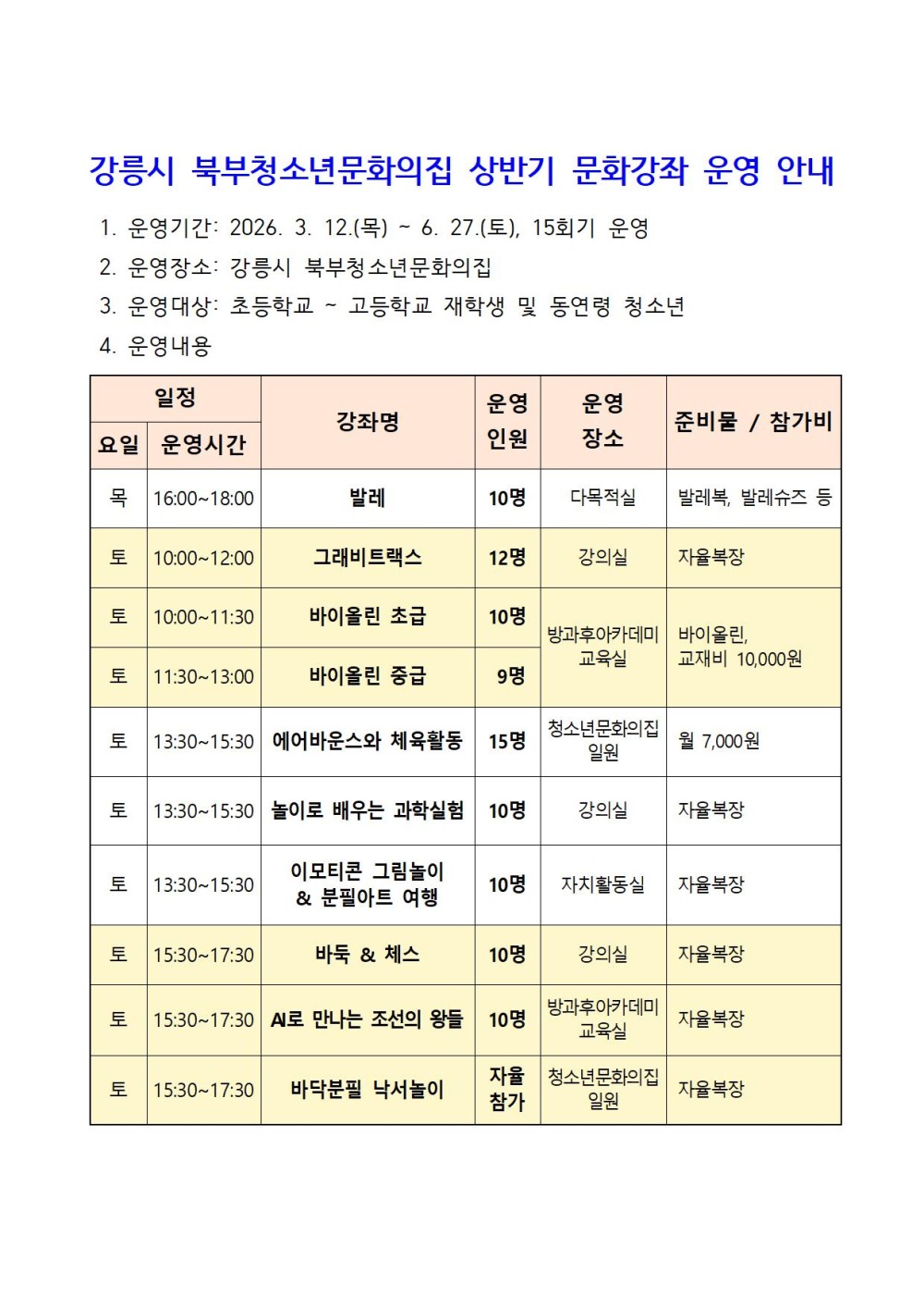 [강릉시] 북부청소년문화의집 상반기 문화강좌 운영 안내