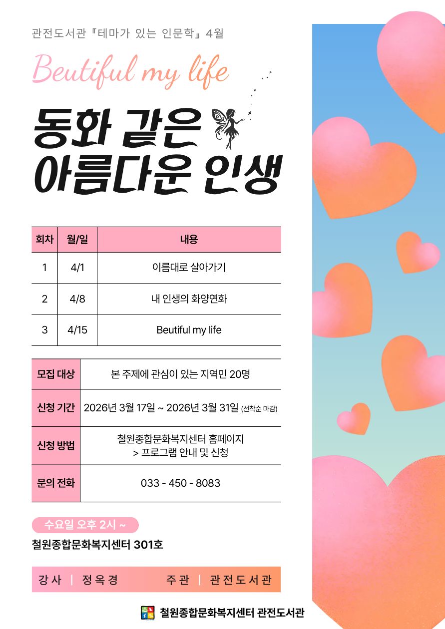 [철원군] [철원종합문화복지센터] 관전도서관 4월 '테마가 있는 인문학'_동화같은 아름다운 인생 Home시군별소식62744 별아기 별아기님의 홈 전체게시물 아이디로 검색 별아기님의 홈 전체게시물 아이디로 검색 12시간 21분전 72 0 0 LV.1 50% 관련링크 : https://www.cwg.go.kr/www/selectBbsNttView.do;CWG_JSESSIONID=6A179F96B039A2CE9A3E7380AA834459?key=206&bbsNo=24&nttNo=269861&searchCtgry=&searchCnd=all&searchKrwd=&integrDeptCod… 1회 연결 신고 목록 게시글 신고 안내 아래 내용중 해당하는 내용이 있을경우 아래 게시글신고 버튼을 클릭하시고 사유를 작성해주시면 빠른시간 안에 삭제및 필요조치하여 드리겠습니다. 로그인후 이용이 가능합니다. 그리고 답변은 메뉴 아이러브강원 > 1:1문의에서 확인이 가능합니다. 자신 또는 제3자를 비방하거나 중상 모략으로 명예를 손상시키는 내용 범죄행위와 관련이 있다고 판단되는 내용 다른 회원 또는 제3자의 저작권 등 기타 권리를 침해하는 내용 타인의 개인정보, 사생활을 침해하거나 명예를 손상시키는 경우 자신의 글을 타인이 도용한 경우 위의 내용 이외에 기타사항 본문 아름다운 인생을 만들기 위한 나의 다짐 실천! [출처 : 철원군청 -시정소식-] 0 로그인 후 추천을 하실 수 있습니다. 별아기 님의 최신글 별아기 님의 최신댓글 시군별소식 - [철원종합문화복지센터] 관전도서관 4월 '테마가 있는 인문학'_동화같은 아름다운 인생 12시간 21분전 시군별소식 - '26년 3월 3주차 포탄사격에 따른 주민홍보 12시간 21분전 시군별소식 - 2026년 상반기 행복학습센터 수강생 모집안내(원어민 프리토킹, 기구필라테스, 테라리움, 토퍼, 드럼 등) 16시간 21분전 시군별소식 - 2026 청소년회관 연계동아리(교육봉사 등) 모집 2026-03-12 시군별소식 - 2026 오늘의농부 라이브커머스 참여 업체 모집 2026-03-12 채용정보 - (재)강원창조경제혁신센터 2026년 제2회 직원 채용(계약직) 공고 2026-03-12 시군별소식 - 2026년 농업인대학 [사과 심화과정] 교육생 모집 2026-03-11 시군별소식 - [제2보병여단] 국지도발대비작전 훈련 안내 2026-03-11 Q&A - 영월 탄광문화촌 가족여행지로 괜찮으신 편입니다 주말에도 크게 붐비진 않고 광부체험·트레인 체험이 인기 많아요! 주변엔 동강 청령포·선암마을 메밀막국수·곤드레밥 맛집 많으십니다 2026-02-26 별아기 님의 최신글 별아기 님의 최신댓글 시군별소식 - [철원종합문화복지센터] 관전도서관 4월 '테마가 있는 인문학'_동화같은 아름다운 인생 12시간 21분전 시군별소식 - '26년 3월 3주차 포탄사격에 따른 주민홍보 12시간 21분전 시군별소식 - 2026년 상반기 행복학습센터 수강생 모집안내(원어민 프리토킹, 기구필라테스, 테라리움, 토퍼, 드럼 등) 16시간 21분전 시군별소식 - 2026 청소년회관 연계동아리(교육봉사 등) 모집 2026-03-12 시군별소식 - 2026 오늘의농부 라이브커머스 참여 업체 모집 2026-03-12 채용정보 - (재)강원창조경제혁신센터 2026년 제2회 직원 채용(계약직) 공고 2026-03-12 시군별소식 - 2026년 농업인대학 [사과 심화과정] 교육생 모집 2026-03-11 시군별소식 - [제2보병여단] 국지도발대비작전 훈련 안내 2026-03-11 Q&A - 영월 탄광문화촌 가족여행지로 괜찮으신 편입니다 주말에도 크게 붐비진 않고 광부체험·트레인 체험이 인기 많아요! 주변엔 동강 청령포·선암마을 메밀막국수·곤드레밥 맛집 많으십니다 2026-02-26 SNS 댓글목록 0 등록된 댓글이 없습니다.