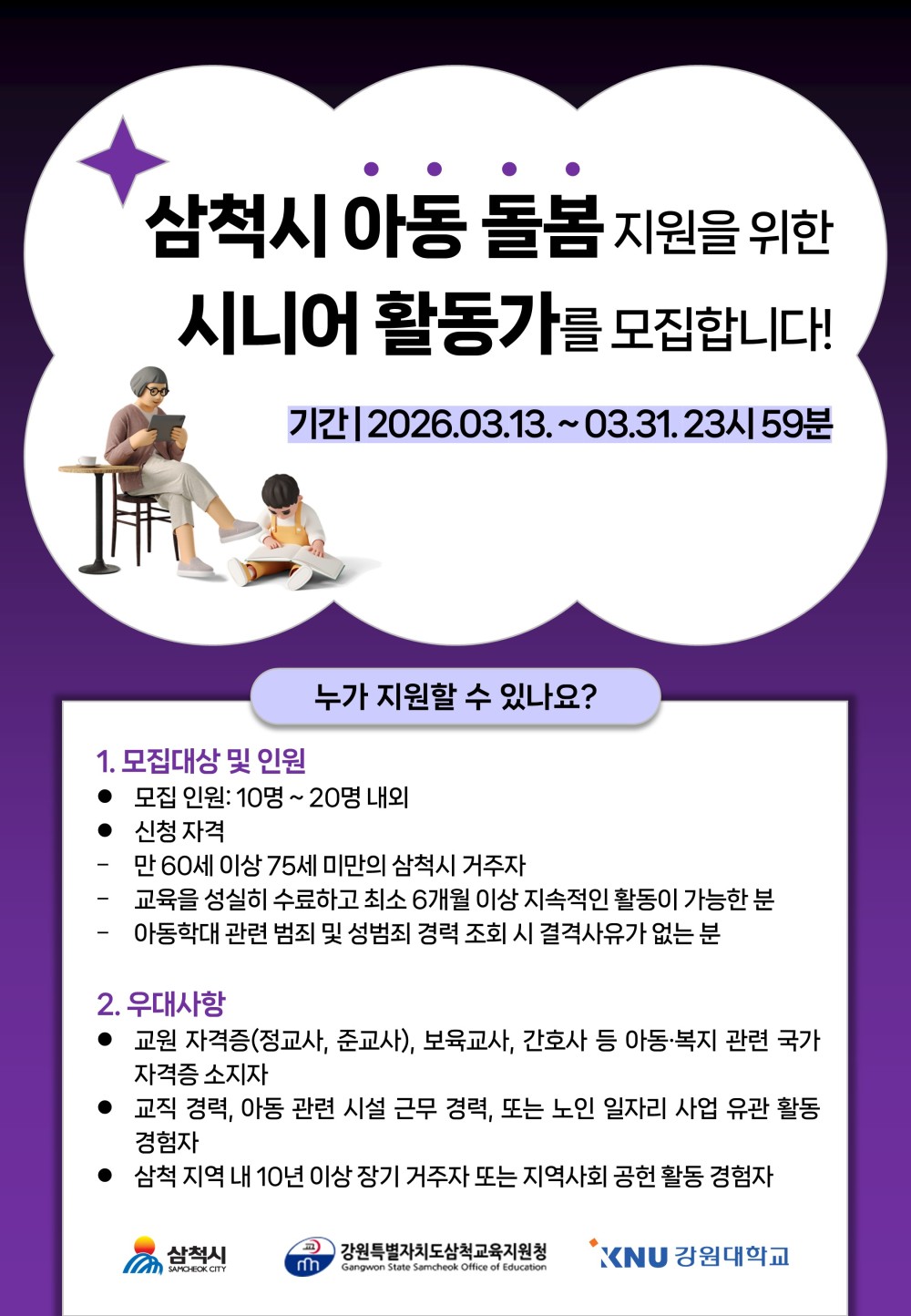 [삼척시] 『삼척시 교육발전특구 사업』아동 돌봄 지원 시니어 활동가 모집 안내
