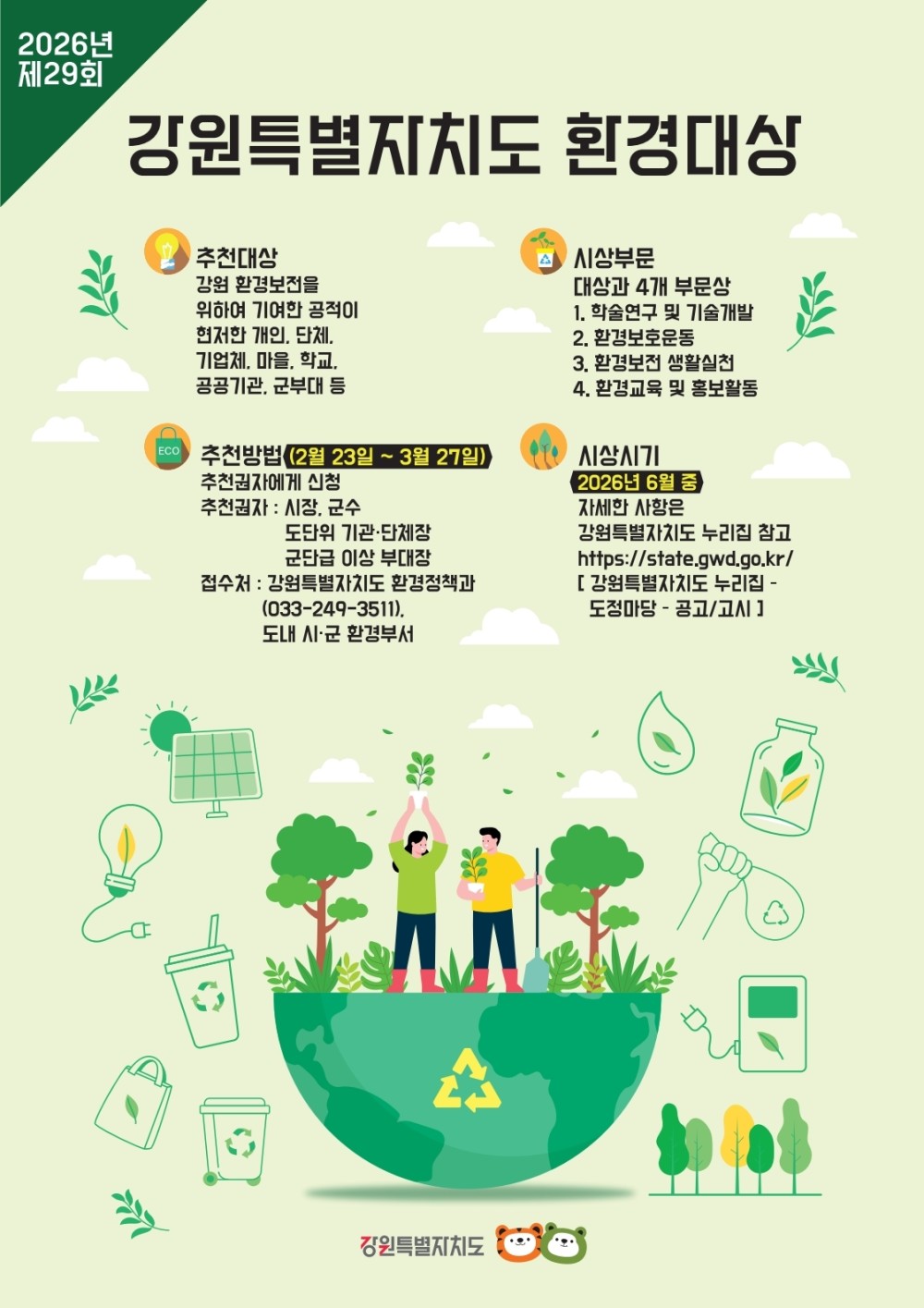- 강원특별자치도 환경대상(시군별 2~3인 개인·단체 수상후보자 추천)