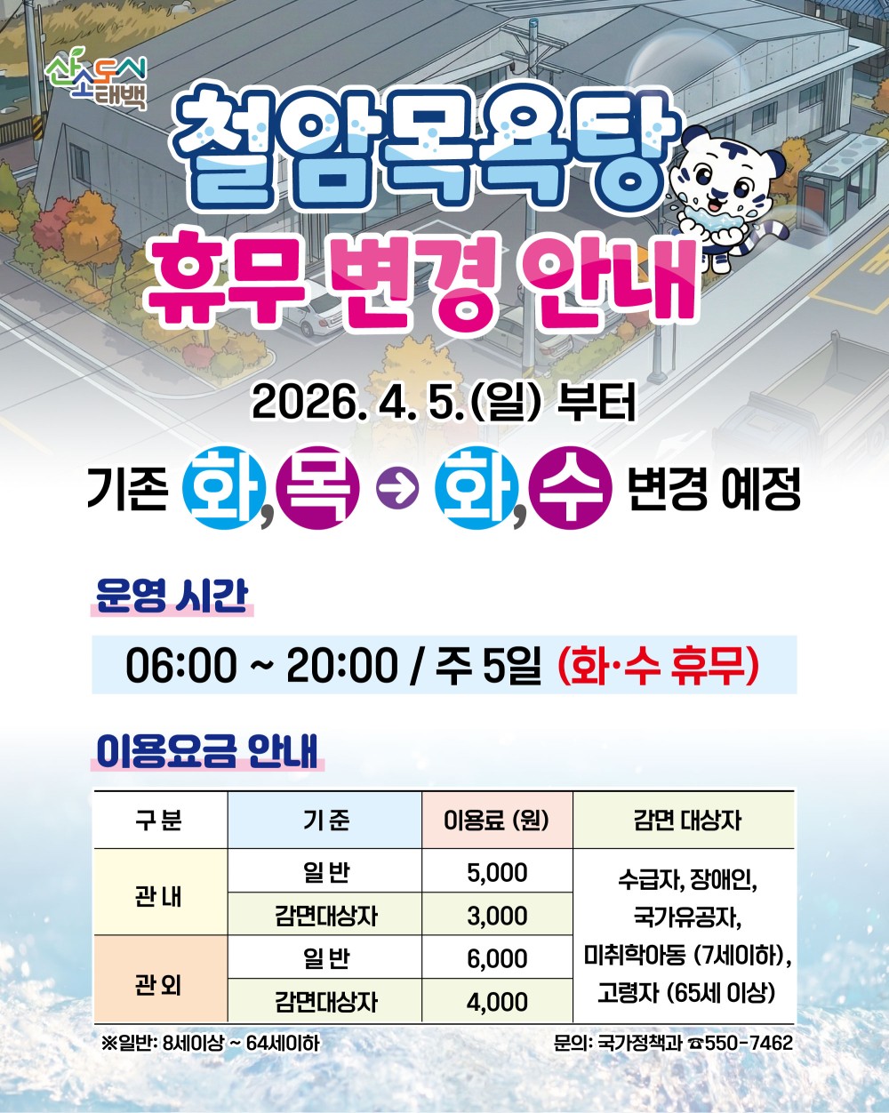 철암목욕탕 휴무일이 *2026. 4. 5.(일)* 부터 변경됩니다.