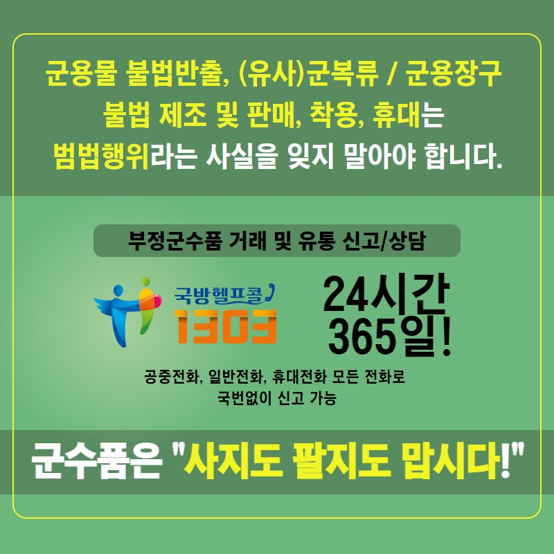※ 군용물 불법반출, (유사)군복류 군용장구의 불법 제조 및 판매, 착용, 휴대는 범법행위라는 사실을 잊지 말아야 합니다.