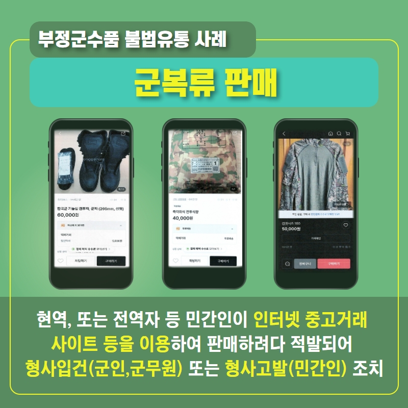 - 현역 또는 전역자 등 민간인이 인터넷 중고거래 사이트 등을 이용하여 판매