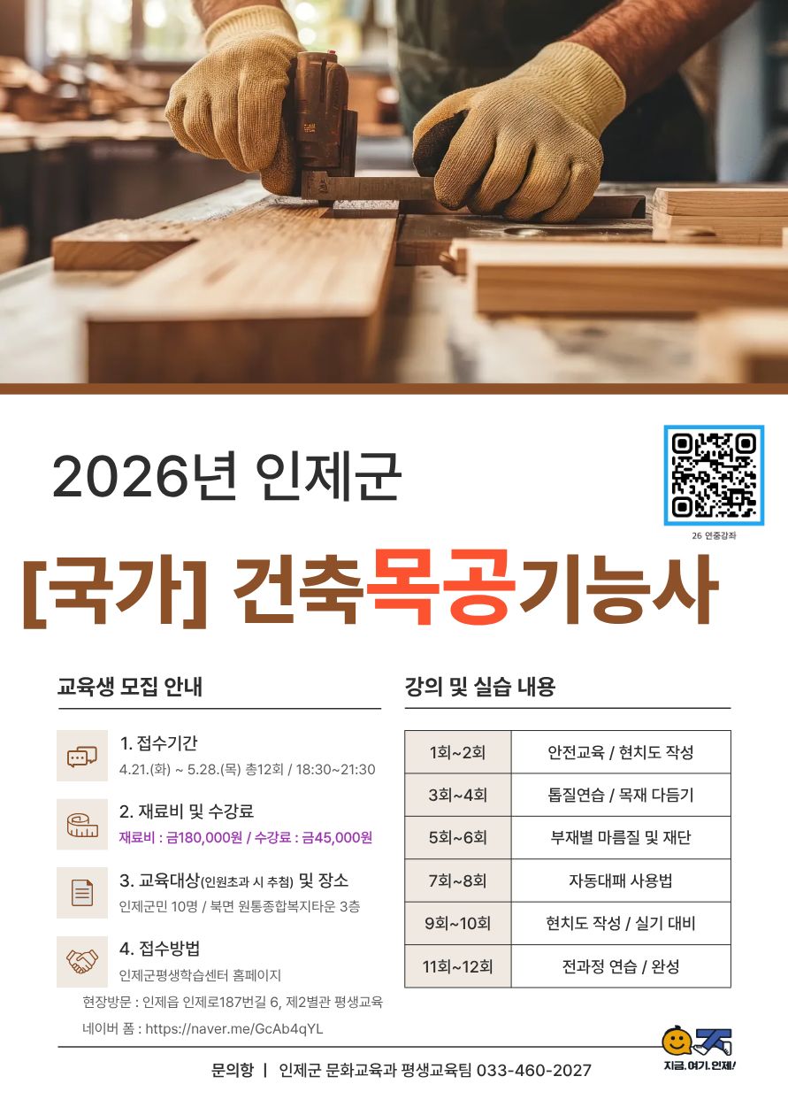 [인제군] [연중강좌] 2026년 건축목공기능사[국가자격] 수강생 모집