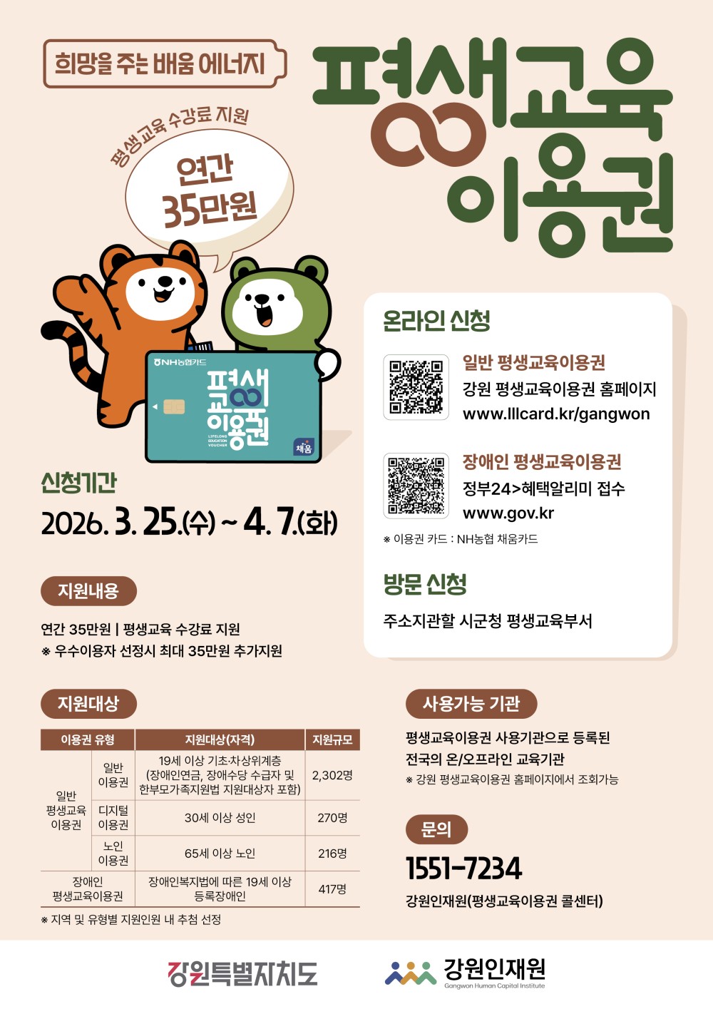 [철원군] 강원 평생교육이용권 신청 안내 Home시군별소식63004 별아기 별아기님의 홈 전체게시물 아이디로 검색 별아기님의 홈 전체게시물 아이디로 검색 2시간 42분전 187 0 0 LV.1 50% 첨부파일 : () 다운로드 관련링크 : https://www.cwg.go.kr/www/selectBbsNttView.do;CWG_JSESSIONID=0882AEB11EC0A3DA0B73AB7A8F851960?key=206&bbsNo=24&nttNo=271402&searchCtgry=&searchCnd=all&searchKrwd=&integrDeptCod… 10회 연결 신고 목록 게시글 신고 안내 아래 내용중 해당하는 내용이 있을경우 아래 게시글신고 버튼을 클릭하시고 사유를 작성해주시면 빠른시간 안에 삭제및 필요조치하여 드리겠습니다. 로그인후 이용이 가능합니다. 그리고 답변은 메뉴 아이러브강원 > 1:1문의에서 확인이 가능합니다. 자신 또는 제3자를 비방하거나 중상 모략으로 명예를 손상시키는 내용 범죄행위와 관련이 있다고 판단되는 내용 다른 회원 또는 제3자의 저작권 등 기타 권리를 침해하는 내용 타인의 개인정보, 사생활을 침해하거나 명예를 손상시키는 경우 자신의 글을 타인이 도용한 경우 위의 내용 이외에 기타사항 본문 강원 평생교육이용권 [출처 : 철원군청 -시정소식-] 0 로그인 후 추천을 하실 수 있습니다. 별아기 님의 최신글 별아기 님의 최신댓글 시군별소식 - 제3보병사단 기동훈련에 따른 안내 2시간 42분전 시군별소식 - 강원 평생교육이용권 신청 안내 2시간 42분전 시군별소식 - [5군단] 합동방공훈련 시 무인기 오인신고 방지를 위한 홍보 2시간 42분전 시군별소식 - '26년 4월 지포리 전차포 사격장 훈련일정 안내 2026-03-26 시군별소식 - "어르신 댁으로 의사와 간호사가 찾아갑니다"- 철원군 장기요양 재택의료센터 시범사업 참여기관 안내 2026-03-25 시군별소식 - 2026년 철원군 평생학습관 문해교육사 3급 양성과정 2026-03-24 시군별소식 - 2026-03-24 시군별소식 - (제6보병사단) 한식 기간 민북지역 성묘 가능일자 안내 2026-03-23 Q&A - 영월 탄광문화촌 가족여행지로 괜찮으신 편입니다 주말에도 크게 붐비진 않고 광부체험·트레인 체험이 인기 많아요! 주변엔 동강 청령포·선암마을 메밀막국수·곤드레밥 맛집 많으십니다 2026-02-26 별아기 님의 최신글 별아기 님의 최신댓글 시군별소식 - 제3보병사단 기동훈련에 따른 안내 2시간 42분전 시군별소식 - 강원 평생교육이용권 신청 안내 2시간 42분전 시군별소식 - [5군단] 합동방공훈련 시 무인기 오인신고 방지를 위한 홍보 2시간 42분전 시군별소식 - '26년 4월 지포리 전차포 사격장 훈련일정 안내 2026-03-26 시군별소식 - "어르신 댁으로 의사와 간호사가 찾아갑니다"- 철원군 장기요양 재택의료센터 시범사업 참여기관 안내 2026-03-25 시군별소식 - 2026년 철원군 평생학습관 문해교육사 3급 양성과정 2026-03-24 시군별소식 - 2026-03-24 시군별소식 - (제6보병사단) 한식 기간 민북지역 성묘 가능일자 안내 2026-03-23 Q&A - 영월 탄광문화촌 가족여행지로 괜찮으신 편입니다 주말에도 크게 붐비진 않고 광부체험·트레인 체험이 인기 많아요! 주변엔 동강 청령포·선암마을 메밀막국수·곤드레밥 맛집 많으십니다 2026-02-26 SNS 댓글목록 0 등록된 댓글이 없습니다.
