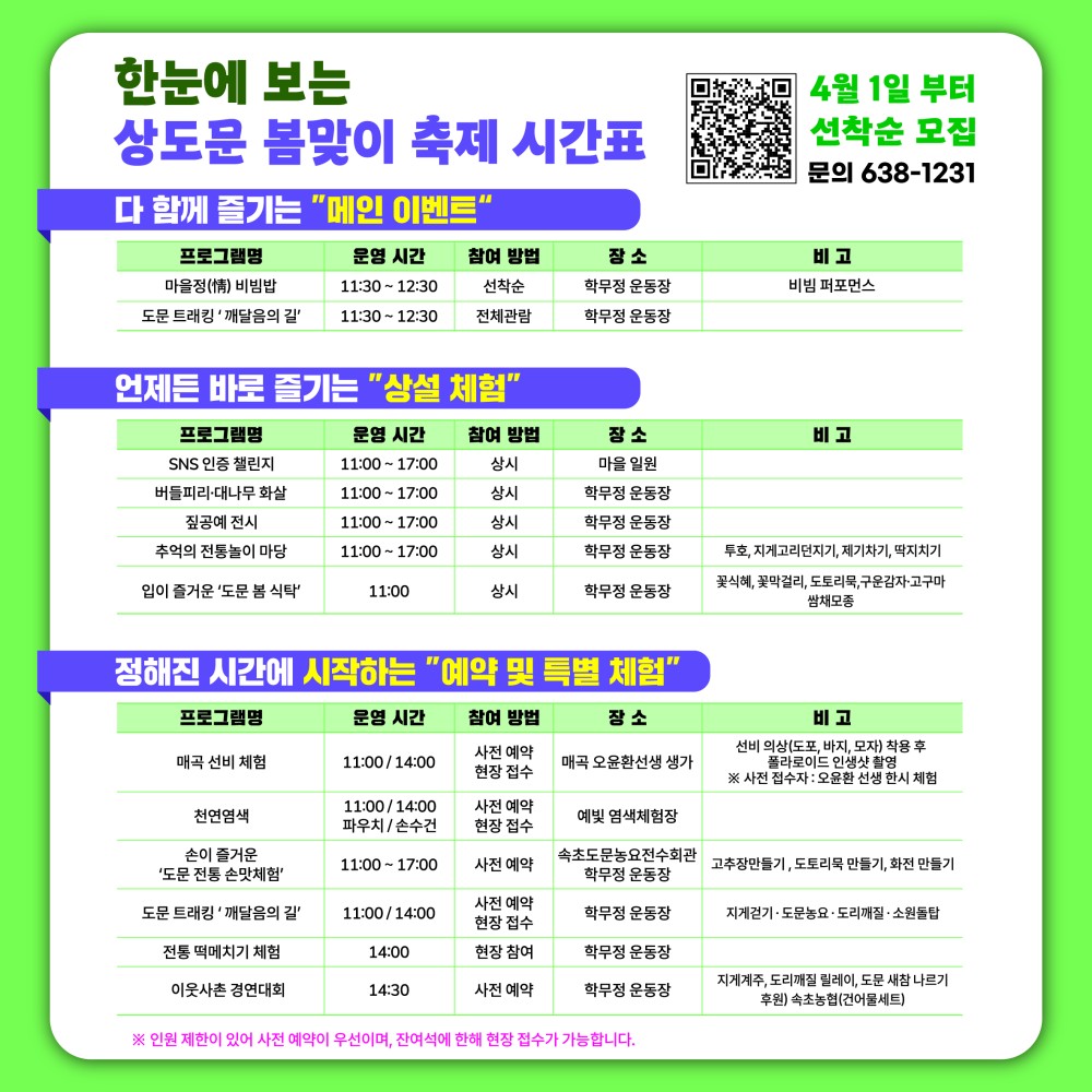 따뜻한 봄기운이 완연한 계절을 맞아, 지역 주민과 방문객이 함께 어우러지는 「2026년 상도문 봄맞이 축제」가 4. 18.(토) 돌담마을 일원에서 개최됩니다.
