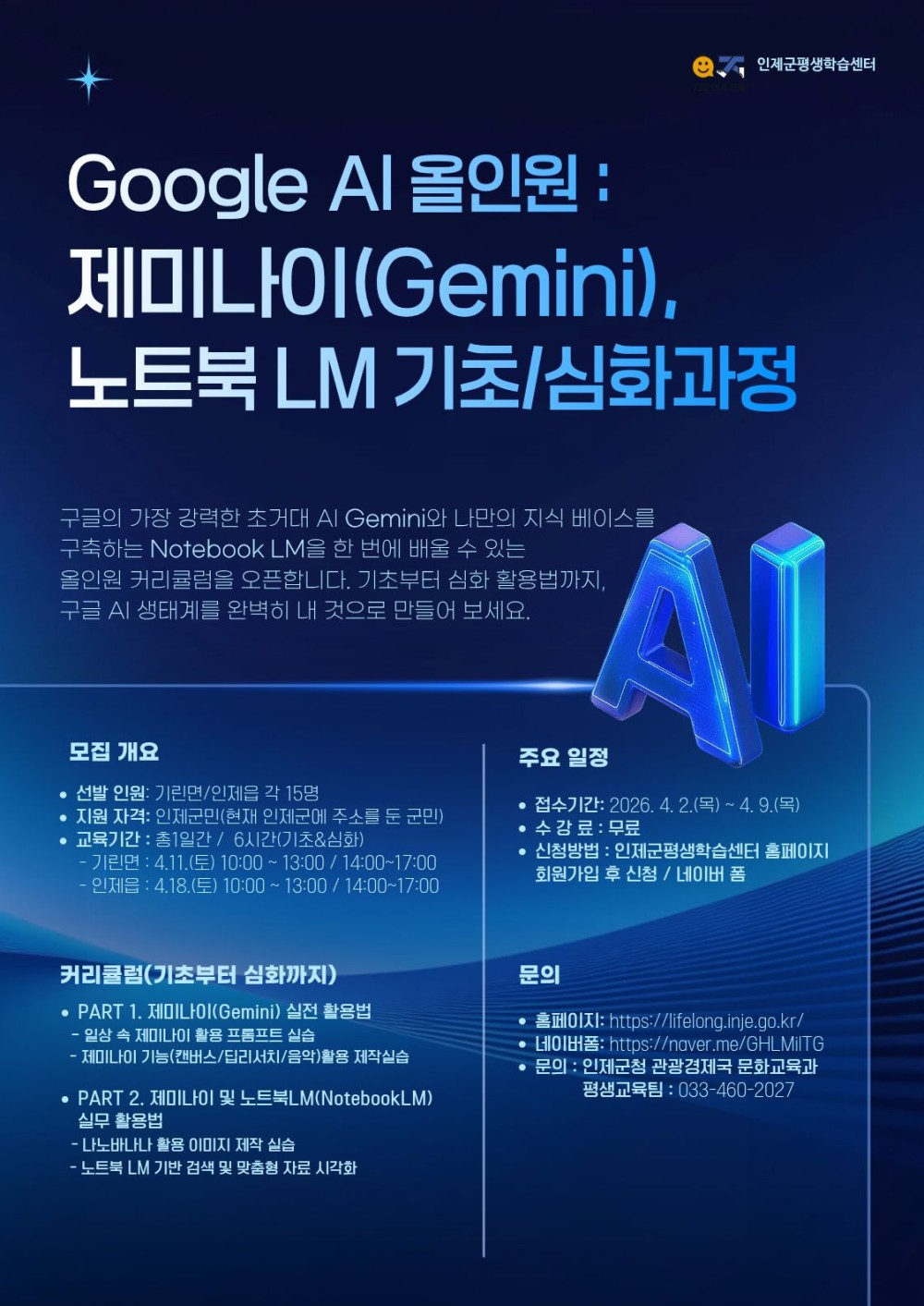 가. 모집강좌 : [인제읍] Google AI 올인원 [기초/심화] - 제미나이, 노트북 LM 사용법 나. 모집인원 : 15명(현재 인제군에 주소를 둔 군민) 모집인원 초과시 추첨 다. 접수기간 : 2026. 4. 2.(목) ~ 4. 9.(목) 라. 운영기간 : - 인제읍 : 2026. 4. 18.(토) 기초 10:00 ~ 13:00 심화 14:00~ 17:00 총 6시간 - 기린면 : 2026. 4. 11.(토) 기초 10:00 ~ 13:00 심화 14:00~ 17:00 총 6시간 마. 운영장소 : 친환경미생물센터 [인제읍 덕산로192번길 66-8, 2층] 바. 수강료 : 무료 사. 접수방법 : - 인제군평생학습센터(https://lifelong.inje.go.kr/) 회원 가입 후 강좌선택 전화접수 방문접수 가능 - 네이버 폼 (https://naver.me/GHLMilTG) |
