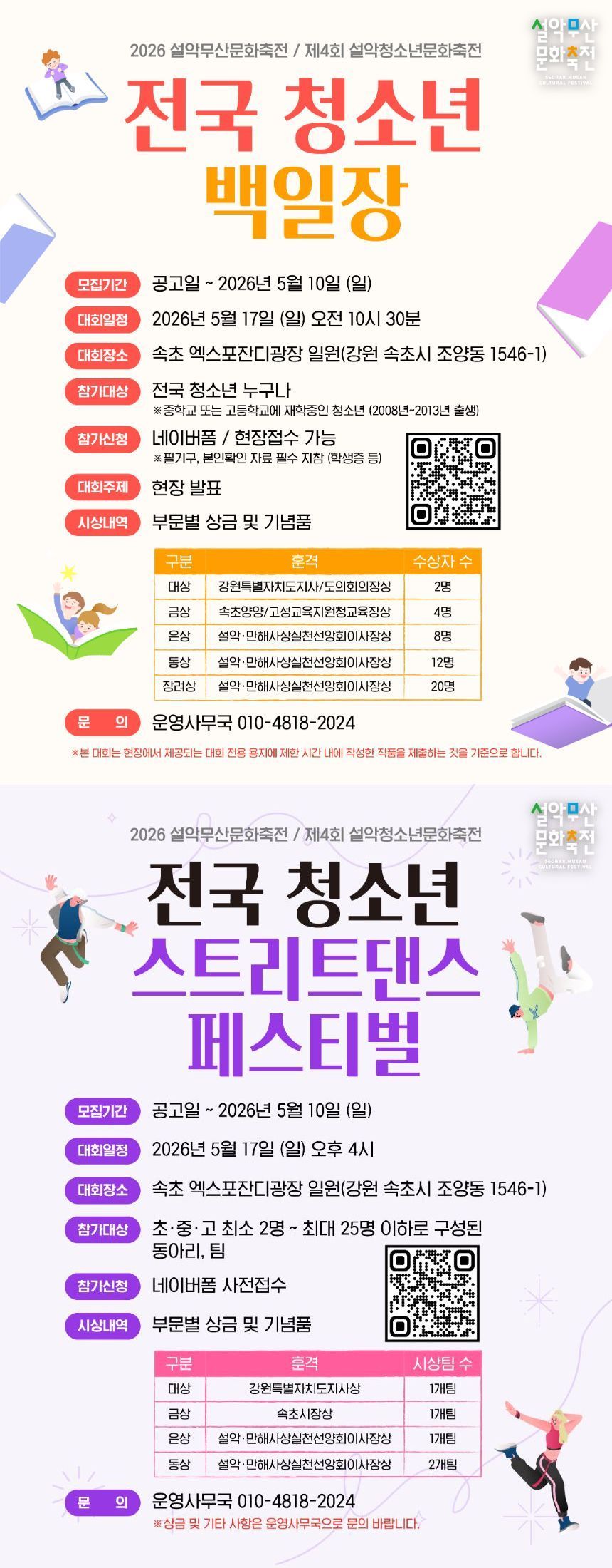 [속초시] [사전모집] 설악무산문화축전-사생대회, 합창대회, 백일장, 댄스