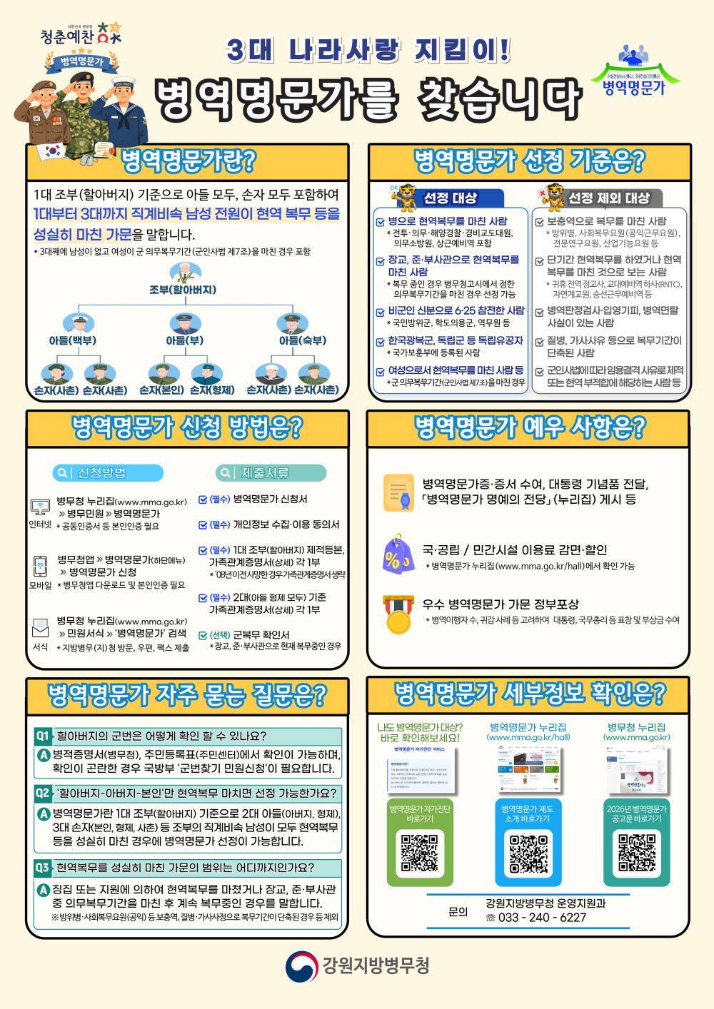 병무청에서는 2004년부터 3대 가족 모두가 현역복무 등을 성실히 마친 가문을 병역 명문가로 선정하여, 병역을 이행한 사람이 존경받고 자긍심을 갖는 사회분위기 조성을 위해 노력하고 있습니다. 이와 관련하여 '붙임'과 같이 안내하오니 적극 참여해주시기 바랍니다.