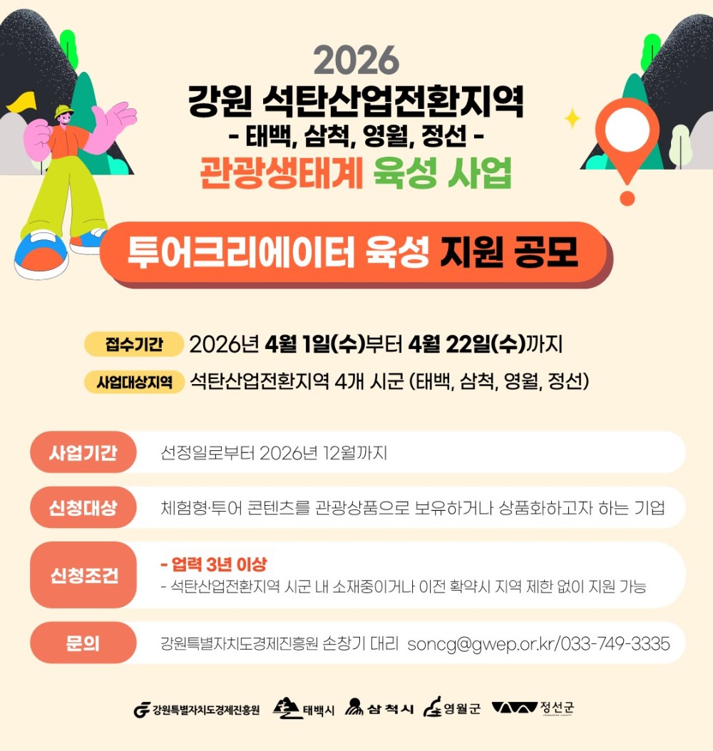 [태백시] 2026 석탄산업전환지역 투어크리에이터 공모 홍보 Home시군별소식63201 열공하자 열공하자님의 홈 전체게시물 아이디로 검색 열공하자님의 홈 전체게시물 아이디로 검색 2시간 21분전 153 0 0 LV.1 11% 첨부파일 : () 다운로드 첨부파일 : 공고문(2026 석탄산업전환지역 투어크리에이터 공모 공고).hwp (80.0K) 다운로드 0 2026-04-06 20:20:02 첨부파일 : 공모 신청 서식(2026 석탄산업전환지역 투어크리에이터 공모).hwp (61.0K) 다운로드 0 2026-04-06 20:20:02 첨부파일 : 사업계획서 ppt 발표자료(2026 석탄산업전환지역 투어크리에이터 공모).ppt (294.5K) 다운로드 0 2026-04-06 20:20:02 관련링크 : https://www.taebaek.go.kr/www/selectBbsNttView.do?key=351&bbsNo=24&nttNo=178808&searchCtgry=&searchCnd=all&searchKrwd=&pageIndex=1&integrDeptCode= 0회 연결 신고 목록 게시글 신고 안내 아래 내용중 해당하는 내용이 있을경우 아래 게시글신고 버튼을 클릭하시고 사유를 작성해주시면 빠른시간 안에 삭제및 필요조치하여 드리겠습니다. 로그인후 이용이 가능합니다. 그리고 답변은 메뉴 아이러브강원 > 1:1문의에서 확인이 가능합니다. 자신 또는 제3자를 비방하거나 중상 모략으로 명예를 손상시키는 내용 범죄행위와 관련이 있다고 판단되는 내용 다른 회원 또는 제3자의 저작권 등 기타 권리를 침해하는 내용 타인의 개인정보, 사생활을 침해하거나 명예를 손상시키는 경우 자신의 글을 타인이 도용한 경우 위의 내용 이외에 기타사항 본문 공고문 및 세부 내용은 붙임 파일을 참조해 주시기 바랍니다. 사진 확대보기 [출처 : 태백시청 -시정소식-] 0 로그인 후 추천을 하실 수 있습니다. 열공하자 님의 최신글 열공하자 님의 최신댓글 시군별소식 - 2026 석탄산업전환지역 주민주도형 활성화 지원사업 공모 홍보 2시간 21분전 시군별소식 - 2026 석탄산업전환지역 투어크리에이터 공모 홍보 2시간 21분전 채용정보 - [모집종료] 안전관리자 모집 6시간 21분전 채용정보 - 삼척시학대피해아동쉼터(여아전용) 직원 채용 공고(긴급) 10시간 21분전 채용정보 - 2026년 상반기 지역공동체 일자리사업(탄탄집수리지원단 관리) 채용 재공고 2026-04-03 시군별소식 - 「모두의 창업 프로젝트」 통합 모집공고 2026-04-03 시군별소식 - 2026년 태백시 한마음 치매극복 걷기행사 개최(비대면) 2026-04-03 채용정보 - - 2026년도 제3회 태백시시설관리공단 기간제근로자 직원 채용 - 최종합격자 발표 공고 2026-04-02 Q&A - 단구동 원주시립중앙도서관3층 디지털자료실가격이 쌉니다기다리는 사람 보면서 100매씩 하세요 14시간 21분전 Q&A - 안녕하세요.열차 정기권은 이용구간내 중도역에서도 타고 내릴수 있습니다.따라서 ITX-청춘 열차 춘천 - 왕십리로 구입하면구간내 중도 정차인역인 청량역에서 타고 내릴수 있습니다.다만 중도역에서는 QR로 개찰구가 열리지 않는만큼역직원의 도움을 받아 통과 하여야 합니다.참고로 잘 아시겠지만 정기권은 열차 승차시간이 특정되어있지 않은만큼 어느출발시간 열차건 관계없이자유롭게 승차할수 있습니다.정기권 중도 정차역 이용에 참고가 되었으면 합니다. 2026-04-03 Q&A - 강릉시 난곡동에 강릉 율곡병원이라고 정신병원이 있습니다정신병동이랑 입원 절차 비용이나 지원되는 게 있는지는 아래 홈페이지에 있는 전화번호로 문의를 해보세요...강릉율곡병원강원특별자치도 강릉시 동해대로3304번길 11 율곡병원강릉율곡병원 강릉율곡병원은 지역사회의 보건의료서비스를 제공하고 있는 기관들과 연계하고 협력하여 지역사회 내에 정신건강 네트워크가 굳건하게 형성될 수 있도록 노력하고 있습니다 진료시간표 진료시간표를 알려드립니다. 평일 AM 09:00 ~ PM 05:30 점심시간 AM 12:30 ~ PM 01:30 (토요일,일… 2026-04-02 열공하자 님의 최신글 열공하자 님의 최신댓글 시군별소식 - 2026 석탄산업전환지역 주민주도형 활성화 지원사업 공모 홍보 2시간 21분전 시군별소식 - 2026 석탄산업전환지역 투어크리에이터 공모 홍보 2시간 21분전 채용정보 - [모집종료] 안전관리자 모집 6시간 21분전 채용정보 - 삼척시학대피해아동쉼터(여아전용) 직원 채용 공고(긴급) 10시간 21분전 채용정보 - 2026년 상반기 지역공동체 일자리사업(탄탄집수리지원단 관리) 채용 재공고 2026-04-03 시군별소식 - 「모두의 창업 프로젝트」 통합 모집공고 2026-04-03 시군별소식 - 2026년 태백시 한마음 치매극복 걷기행사 개최(비대면) 2026-04-03 채용정보 - - 2026년도 제3회 태백시시설관리공단 기간제근로자 직원 채용 - 최종합격자 발표 공고 2026-04-02 Q&A - 단구동 원주시립중앙도서관3층 디지털자료실가격이 쌉니다기다리는 사람 보면서 100매씩 하세요 14시간 21분전 Q&A - 안녕하세요.열차 정기권은 이용구간내 중도역에서도 타고 내릴수 있습니다.따라서 ITX-청춘 열차 춘천 - 왕십리로 구입하면구간내 중도 정차인역인 청량역에서 타고 내릴수 있습니다.다만 중도역에서는 QR로 개찰구가 열리지 않는만큼역직원의 도움을 받아 통과 하여야 합니다.참고로 잘 아시겠지만 정기권은 열차 승차시간이 특정되어있지 않은만큼 어느출발시간 열차건 관계없이자유롭게 승차할수 있습니다.정기권 중도 정차역 이용에 참고가 되었으면 합니다. 2026-04-03 Q&A -