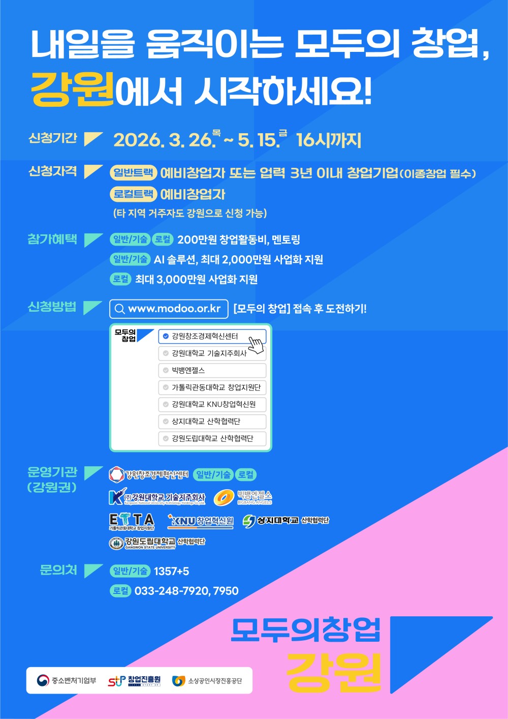 * 신청방법: 모두의 창업 플랫폼(www.modoo.or.kr) 접속 후 신청 (멘토기관은 강원권 운영기관 선택)