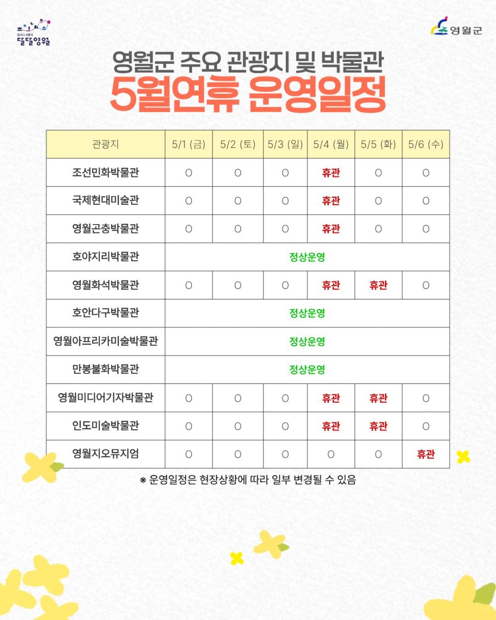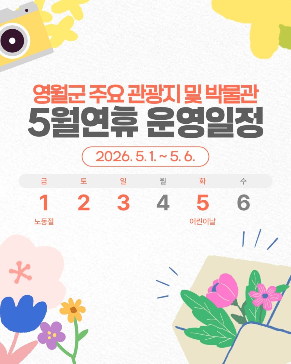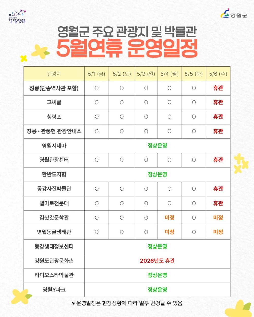 [영월군] 2026년 5월 연휴 영월군 주요 관광지 및 박물관 운영 일정