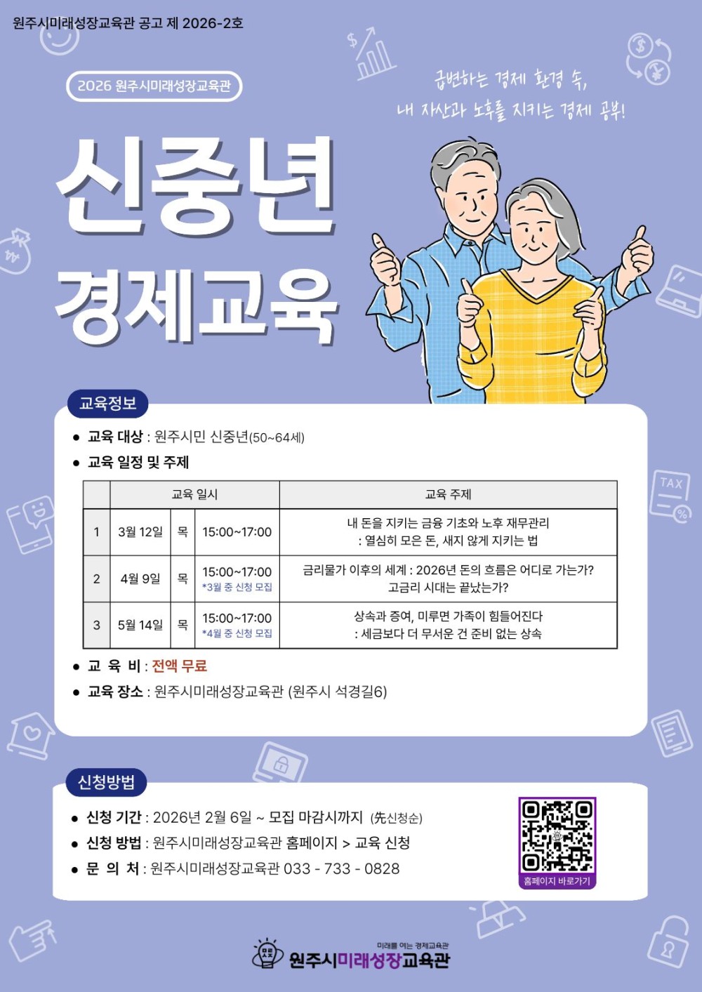 미래를 여는 경제교육관 「원주시미래성장교육관」에서 '5월 신중년경제교육' 신청 접수중이니 많은 관심과 참여 부탁드립니다.
