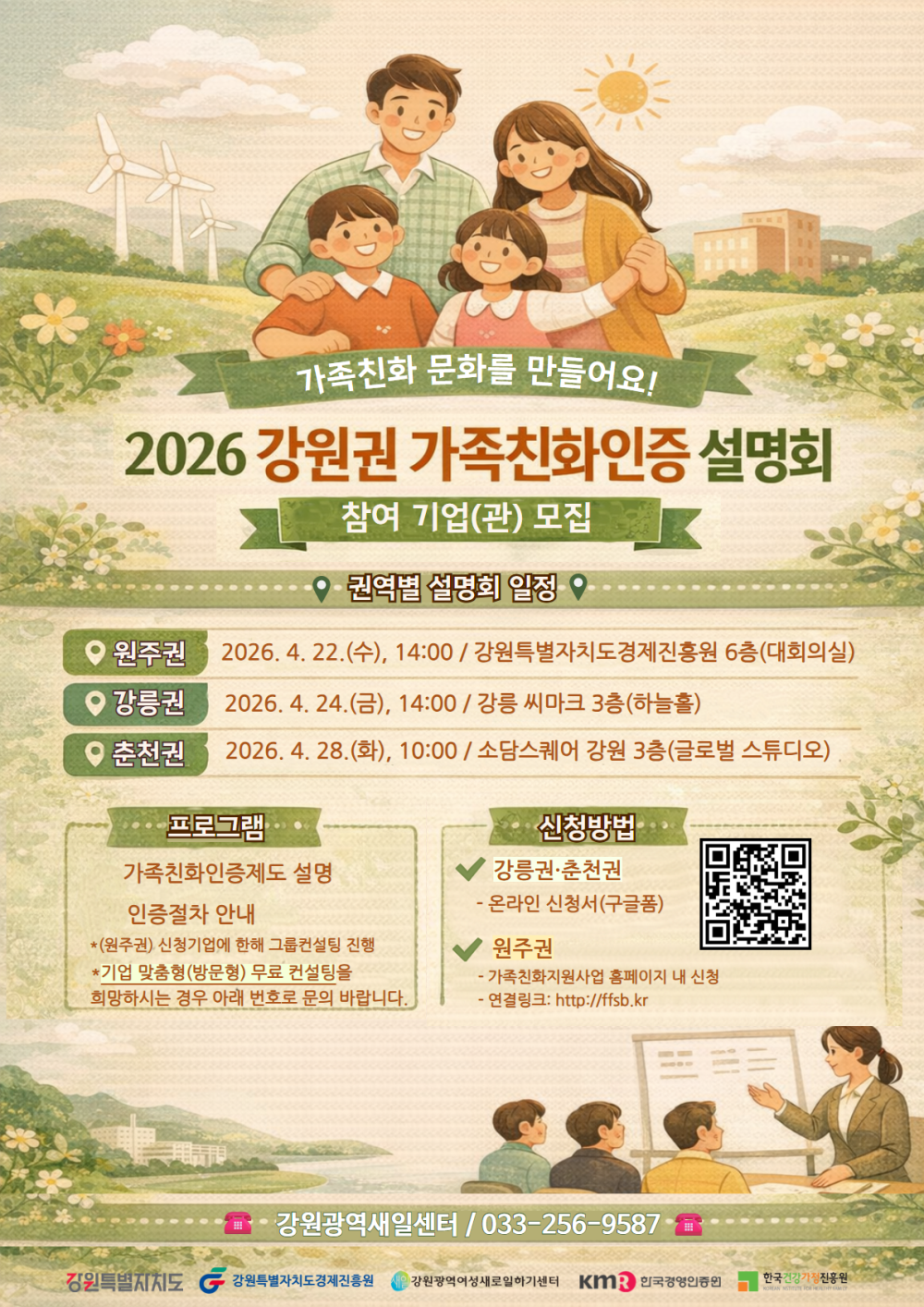 ③ (춘천권) 2026. 4. 28.(화) 10:00 춘천 소담스퀘어 강원 3층(글로벌 스튜디오)□ 내 용: 제도 설명(인증절차, 평가항목, 심사기준 등), 신청방법 및 구비서류 작성안내 등□ 대 상: 가족친화인증을 준비하거나 관심있는 기업·기관 담당자□ 신청방법