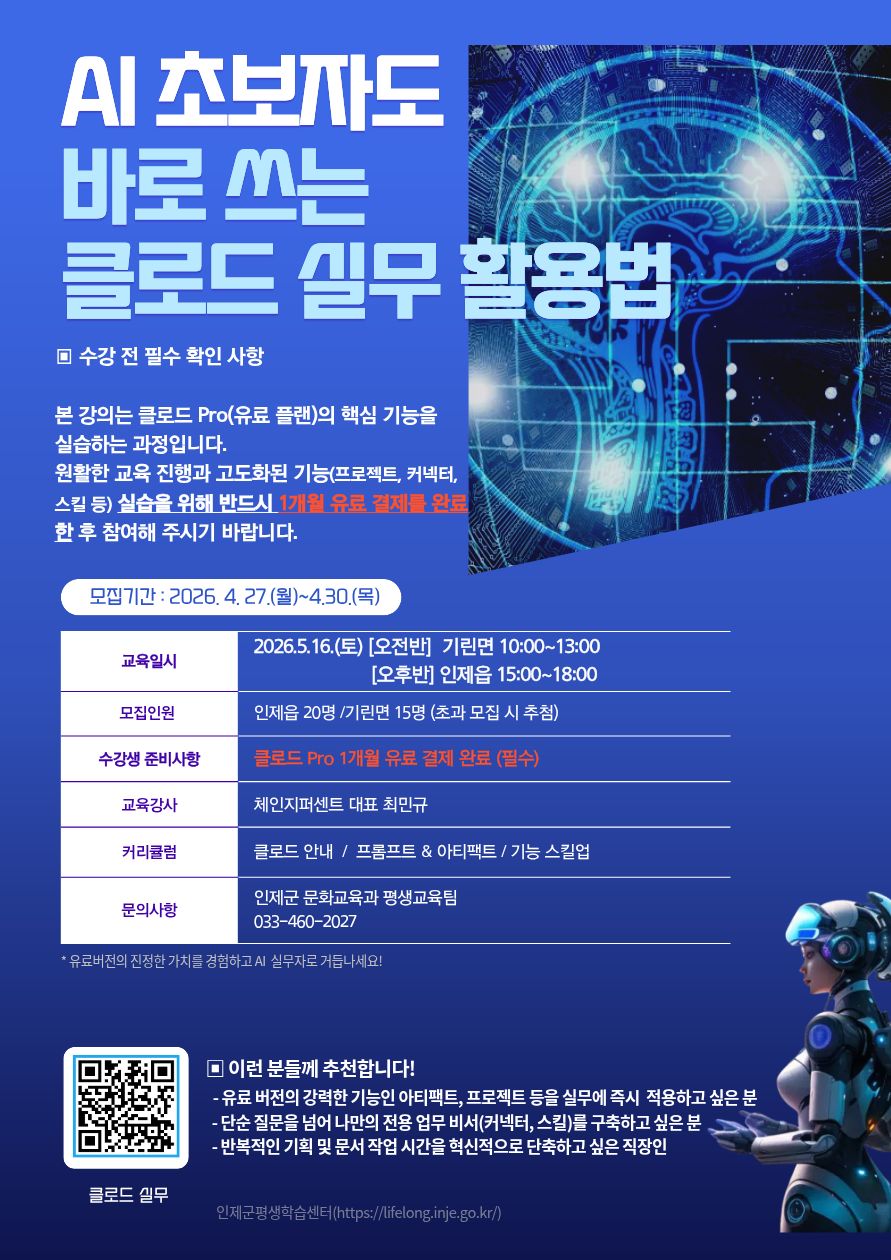 [인제군] [특강] AI초보자도 바로 쓰는 클로드 실무활용법[인제읍/기린면]