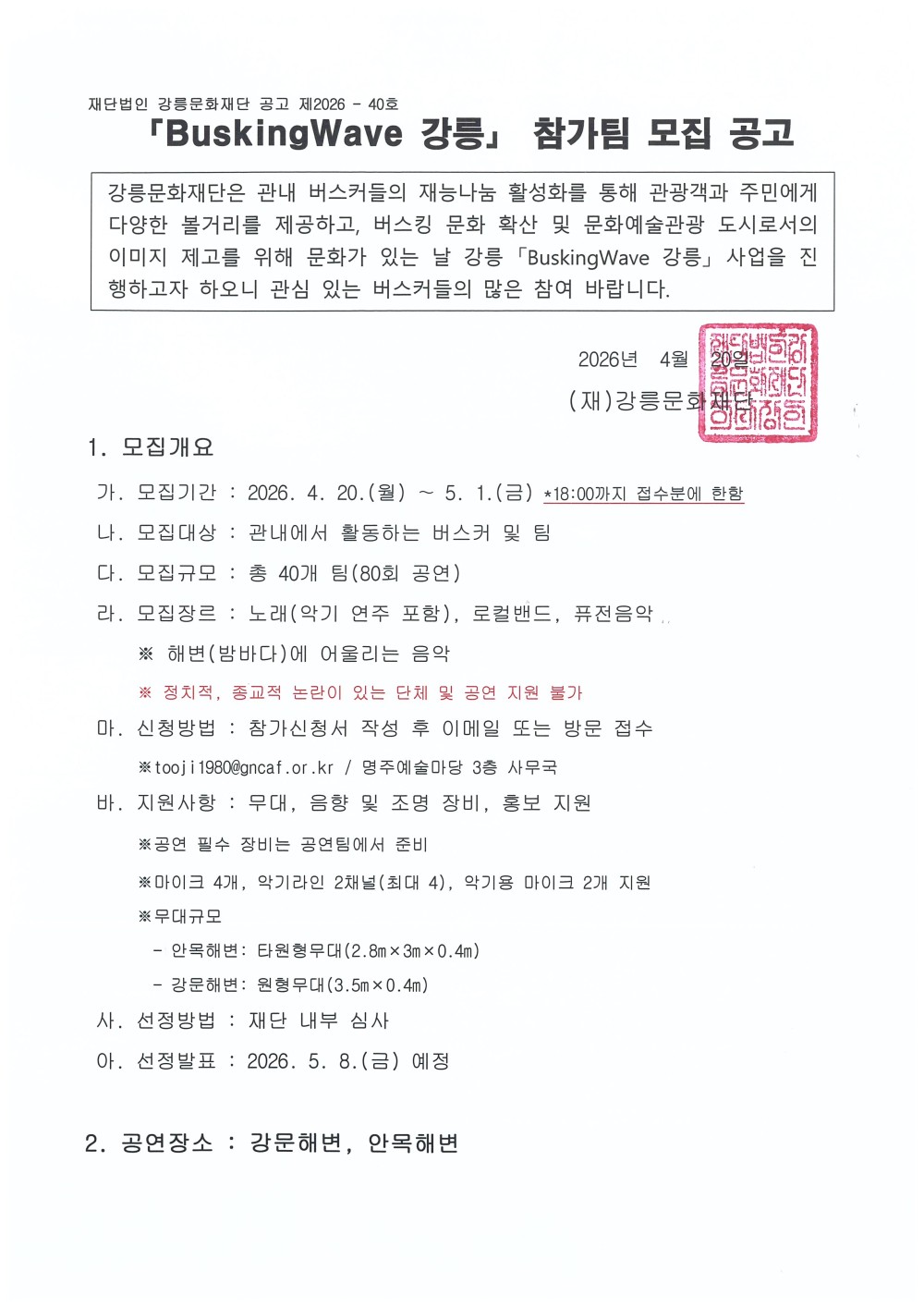 강릉문화재단은 관내 버스커들의 재능 나눔 활성화를 통해 다양한 볼거리를 제공하고, 버스킹 문화 확산 및 문화예술관광 도시로서의 이미지를 제고하기 위해 ‘문화가 있는 날 강릉 「Busking Wave 강릉」’ 사업을 추진하고자 하오니, 관심 있는 분들의 많은 참여를 바랍니다.