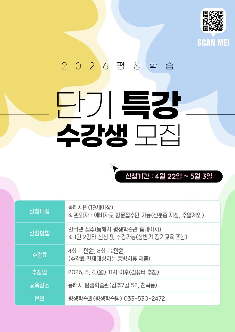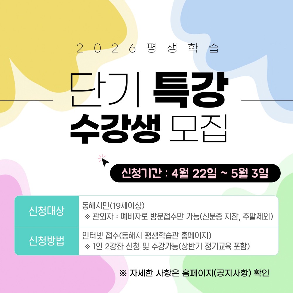 [동해시] 2026년 평생학습 단기특강 수강생 모집안내 Home시군별소식63481 냥탱이 냥탱이님의 홈 전체게시물 아이디로 검색 냥탱이님의 홈 전체게시물 아이디로 검색 2시간 38분전 85 0 0 LV.1 53% 관련링크 : https://www.dh.go.kr/www/selectBbsNttView.do;JSESSIONID=EEA71623293B74C21FAA027E6C9896E9?key=474&bbsNo=172&nttNo=201244&searchCtgry=&searchCnd=all&searchKrwd=&integrDeptCode=&a… 0회 연결 신고 목록 게시글 신고 안내 아래 내용중 해당하는 내용이 있을경우 아래 게시글신고 버튼을 클릭하시고 사유를 작성해주시면 빠른시간 안에 삭제및 필요조치하여 드리겠습니다. 로그인후 이용이 가능합니다. 그리고 답변은 메뉴 아이러브강원 > 1:1문의에서 확인이 가능합니다. 자신 또는 제3자를 비방하거나 중상 모략으로 명예를 손상시키는 내용 범죄행위와 관련이 있다고 판단되는 내용 다른 회원 또는 제3자의 저작권 등 기타 권리를 침해하는 내용 타인의 개인정보, 사생활을 침해하거나 명예를 손상시키는 경우 자신의 글을 타인이 도용한 경우 위의 내용 이외에 기타사항 본문 이미지 확대보기 이미지 확대보기 2026년 평생학습 단기특강 수강생 모집안내 [출처 : 동해시청 -시정소식-] 0 로그인 후 추천을 하실 수 있습니다. 냥탱이 님의 최신글 냥탱이 님의 최신댓글 시군별소식 - 2026년 평생학습 단기특강 수강생 모집안내 2시간 38분전 채용정보 - 생활복지사 모집 18시간 38분전 채용정보 - 방문요양 요양보호사 모집 18시간 38분전 시군별소식 - 해외 주요국가 식품원료 데이터베이스(DB) 가이드 안내 2026-04-21 채용정보 - 요양보호사 (주주야야비비) 모집 2026-04-20 시군별소식 - 황지남부교회 지붕슬레이트 철거공사 알림 2026-04-20 시군별소식 - 「알기 쉬운 식품등의 품목제조보고 요령」 민원인 안내서 알림 2026-04-20 시군별소식 - 강릉「성보필리오 더 센트럴힐즈」장애인 기관추천 특별공급 홍보 2026-04-17 Q&A - 네요즘에는 영월ㅇ읍내 식당에서식사를 하려면줄을 서게 되더라구요영화 왕사남의 덕분이라고 봅니다영월 지역경제발전에 기여를 했으면 좋겠습니다!!!!! 2026-03-27 냥탱이 님의 최신글 냥탱이 님의 최신댓글 시군별소식 - 2026년 평생학습 단기특강 수강생 모집안내 2시간 38분전 채용정보 - 생활복지사 모집 18시간 38분전 채용정보 - 방문요양 요양보호사 모집 18시간 38분전 시군별소식 - 해외 주요국가 식품원료 데이터베이스(DB) 가이드 안내 2026-04-21 채용정보 - 요양보호사 (주주야야비비) 모집 2026-04-20 시군별소식 - 황지남부교회 지붕슬레이트 철거공사 알림 2026-04-20 시군별소식 - 「알기 쉬운 식품등의 품목제조보고 요령」 민원인 안내서 알림 2026-04-20 시군별소식 - 강릉「성보필리오 더 센트럴힐즈」장애인 기관추천 특별공급 홍보 2026-04-17 Q&A - 네요즘에는 영월ㅇ읍내 식당에서식사를 하려면줄을 서게 되더라구요영화 왕사남의 덕분이라고 봅니다영월 지역경제발전에 기여를 했으면 좋겠습니다!!!!! 2026-03-27 SNS 댓글목록 0 등록된 댓글이 없습니다.