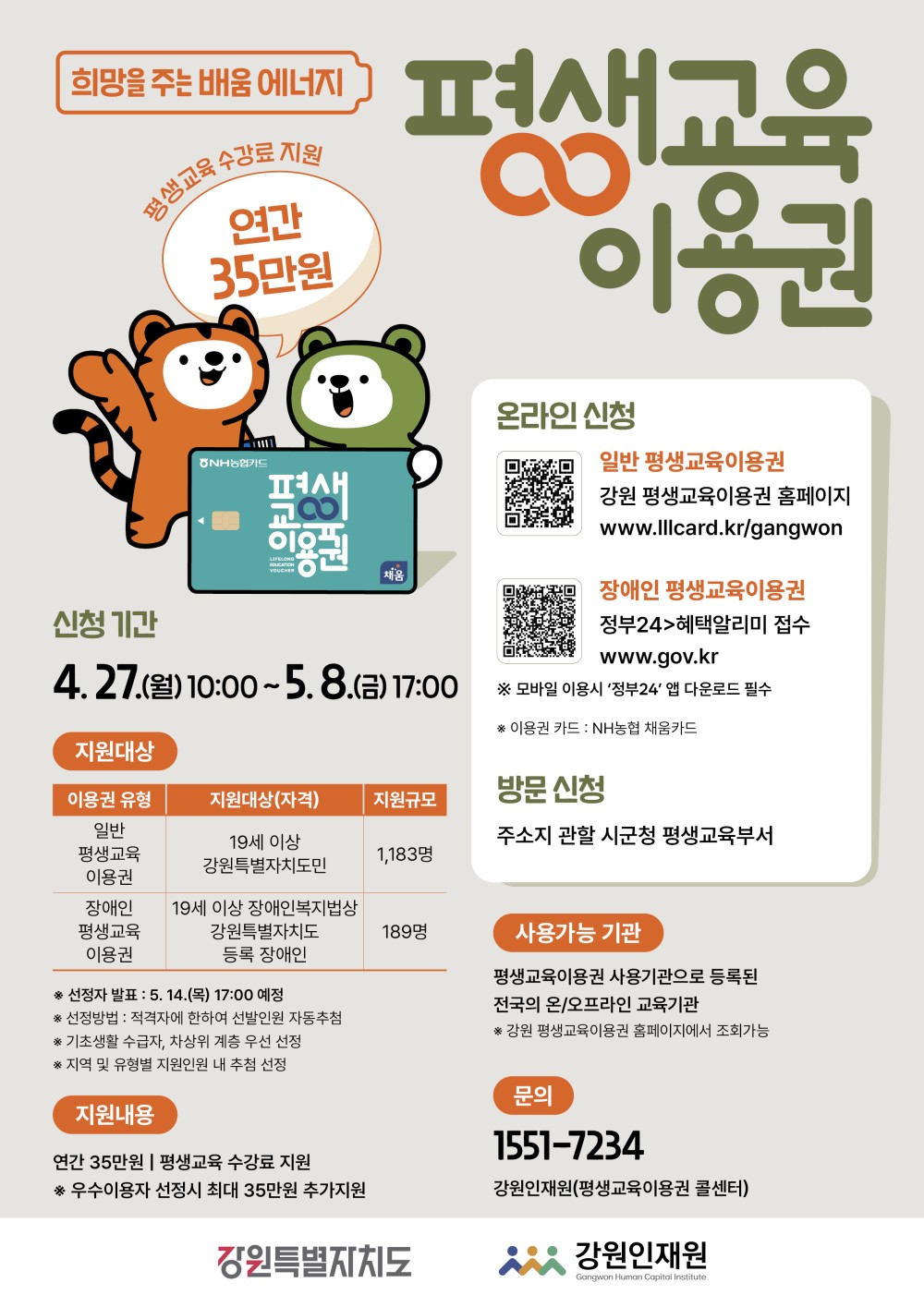 [화천군] 희망을 주는 배움 에너지 "평생교육 이용권" 2차 모집 안내