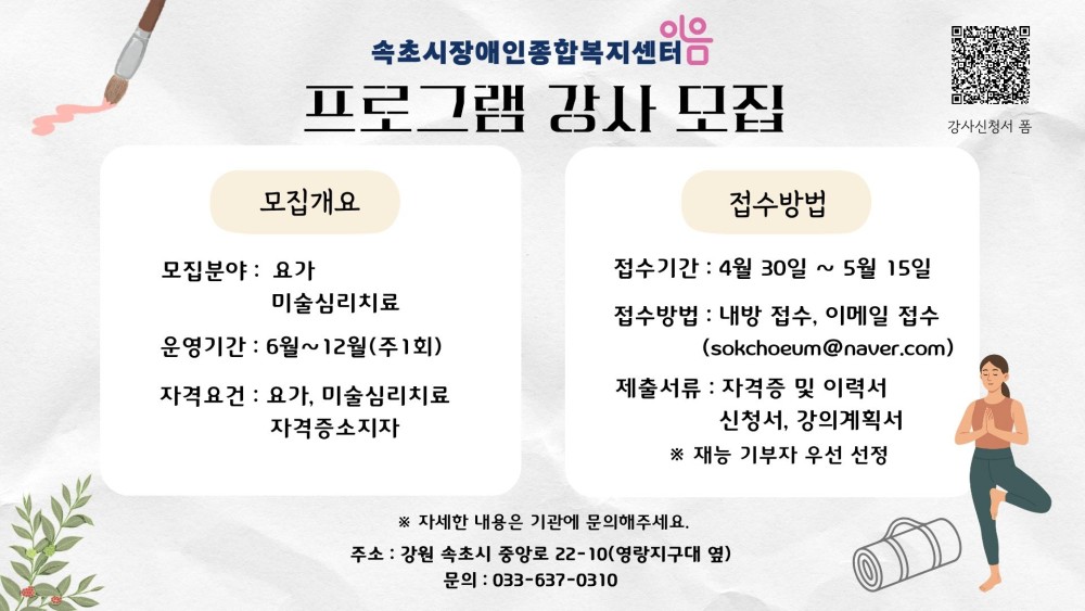 장애인 요가, 미술 심리치료 프로그램 강사를 모집(재능기부 포함)합니다.