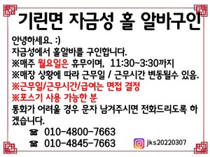 기린면 자금성에서 홀알바 구인합니다.[출처 :인제군청 -채용정보-]