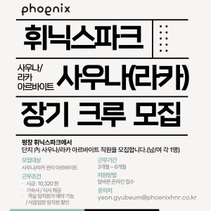 2. 근무조건1) 급여 : 시급 10,320원2) 근무 시간 : 스케줄에 따른 협의 (오픈조 / 마감조)3) 근무 기간 : 본인 시작 가능일 ~ 장기 근무 가능3. 기타1) 기숙사, 식사 제공2) 셔틀버스 운행 (원주, 강릉, 평창, 봉평, 대화)3) 객실 임직원가 예약4) 식음업장 임직원 할인※ 모든 복리후생 내용은 근무(재직)기간 한정하여 제공 가능합니다.4. 지원방법문자 또는 이메일 간단지원(이름/성별/나이/근무시작가능일/기타 희망 기재 사항)예시) 홍길동/남/30세/26.04.05/사우나라카 관리 경력 있음채용 담당자 휘닉스파크 평창 인사팀 연규범 매니저전화번호 : O1O-4924-8675이메일 : yeon.gyubeum@phoenixhnr.co.kr[출처 :평창군청 -채용정보-]