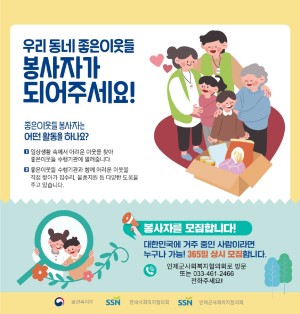 저희 사회복지협의회의 고유 업무인 복지 사각 지대 발굴 및 지원 사업으로 좋은 이웃들 사업을 진행하고 있습니다. 좋은 이웃들 사업의 핵심 구성원인 2026년 좋은 이웃들 사업 자원봉사자 및 단체를 모집합니다. 관 내 복지 사각지대에 계시는 어려운 이웃들을 발굴 신고 및 지원해 주시는 업무이며, 발굴, 지원 시 사회복지자원봉사인증 시간 인증해드립니다.