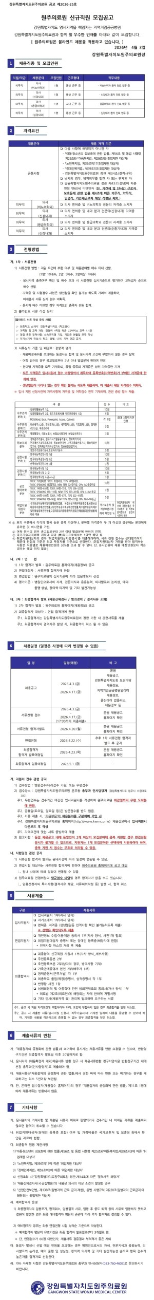 4. 전형일정- 공고 및 접수: 2026. 4. 2.(목) ~ 4. 9.(목) 18:00 까지- 직무적합성 심사 및 최종합격자 발표: 2026. 4. 10.(금) 예정- 근무시작일: 2025. 4. 20.(월) 예정* 내부사정에 따라 변경될 수 있음