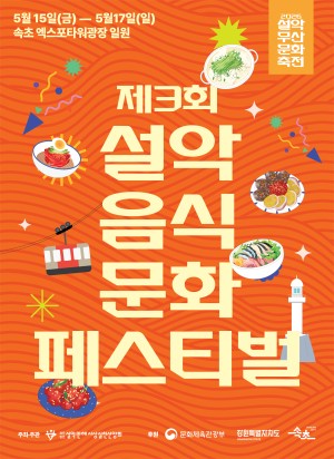 \'2026 설악무산문화축전\' 축제기간 음식부스 운영에 참가할 분을 모집합니다. - 축제기간: 2026년 5월 15일(금) ~ 17일(일) / 3일간 - 음식부스 설치장소: 엑스포타워 광장 일원 - 접수기간: 2026. 4. 1.(수) ~ 4. 26.(일) 18:00 도착분 - 신청방법: 공고문 내 신청서류 작성 후 이메일(seorakyouthfestival@gmail.com) 제출 - 상세내용: 첨부파일 참조