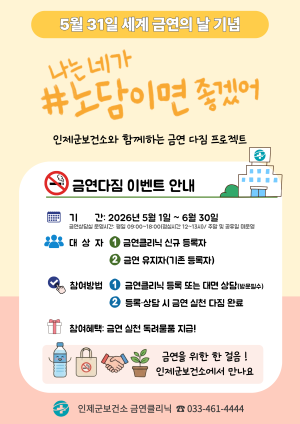 - 무료 금연 캠프: 2026. 5. 19.(화)~ 5. 23.(토)자세한 참여 방법은 포스터 및 QR코드를 참고해주시기 바라며,