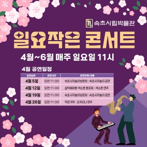 속초시립박물관에서는 우리 지역 전통문화 계승과 공연 문화 활성화를 위해 「일요 작은 콘서트」를 개최합니다. 강원특별자치도 무형유산인 속초사자놀이를 비롯해 지역 문화예술인들이 함께 참여해 관람객들에게 다채롭고 흥겨운 무대를 선보일 예정입니다.시민 여러분과 속초를 찾는 관광객 여러분의 많은 관심과 관람을 바라며, 박물관에서 즐거운 시간 함께하시기 바랍니다. □ 일시 : 2026. 4. 5.(일) ~ 4. 26.(일), 11:00□ 장소 : 속초시립박물관 야외공연장
