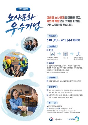 고용노동부와 노사발전재단에서는 매년 노사파트너십을 통한 노사협력 및 사회적 책임을 모범적으로 실천하고 있는 기업을 선정하여 포상하고, 각종 행정상·금융상 혜택을 제공하고 있습니다.이에 2026년도 노사문화 우수기업 및 대상 선정사업 계획을 붙임과 같이 안내드리오니 많은 관심 및 참여 바랍니다.
