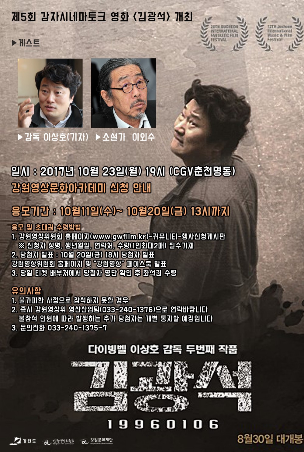 | [행사/춘천시] [강원영상위원회] 제5회 감자시네마토크 <김광석> 개최! | 행사 | 춘천시 | 2017-10-23 | 2017-10-23 |